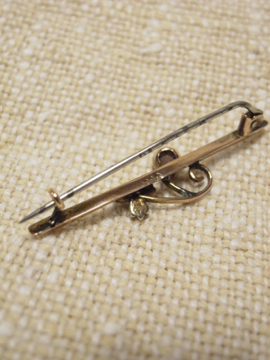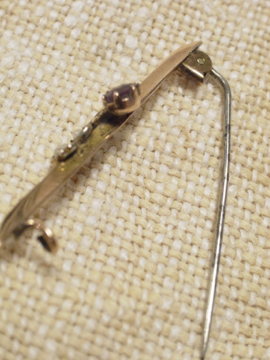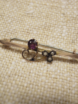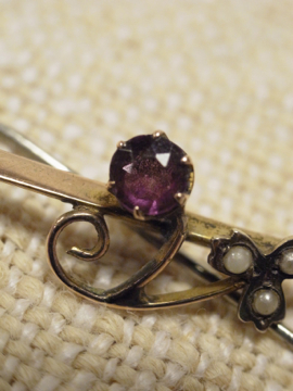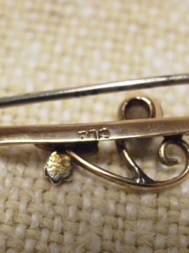 1920年代頃につくられた9金のブローチ/ピン。華奢なデザインで、花の紫色とクローバーの白、それらとゴールドの色合いが可愛らしく上品です。アメジストとパールのように見えますが、ガラス等の可能性もあります。裏側にゴールドの刻印があります。