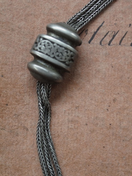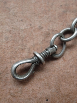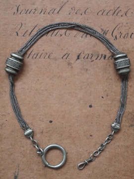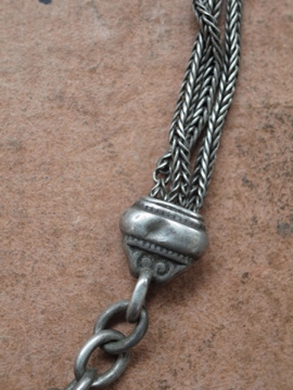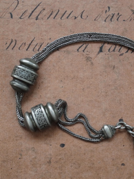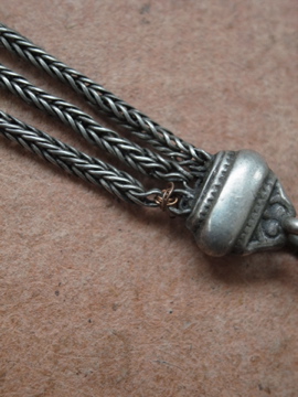 19世紀から20世紀初期頃までにつくられたシルバー・ウオッチ・チェーン。フレンチ・シルバーの刻印があります。三連の細いチェーンが束になり2つの飾りを通っています。飾りは留っておらず動きます。チェーンのつなぎ目に所々傷みが見られ、1カ所直しがあります。スクラッチや、小さなへこみ等、経年の傷みがありますが使用には問題ない程度です。