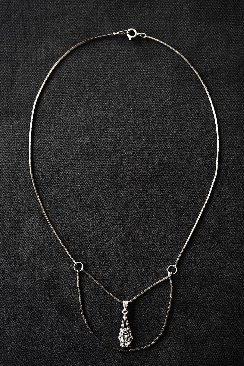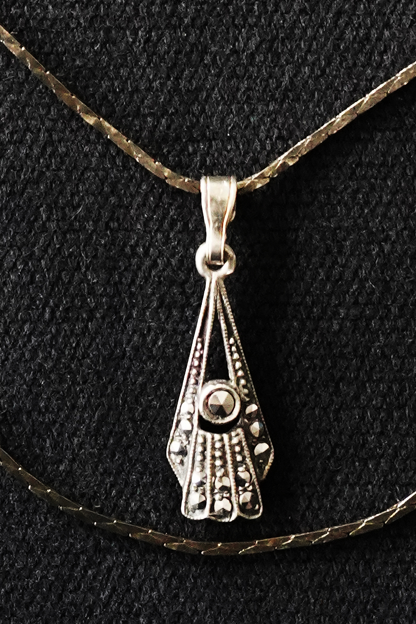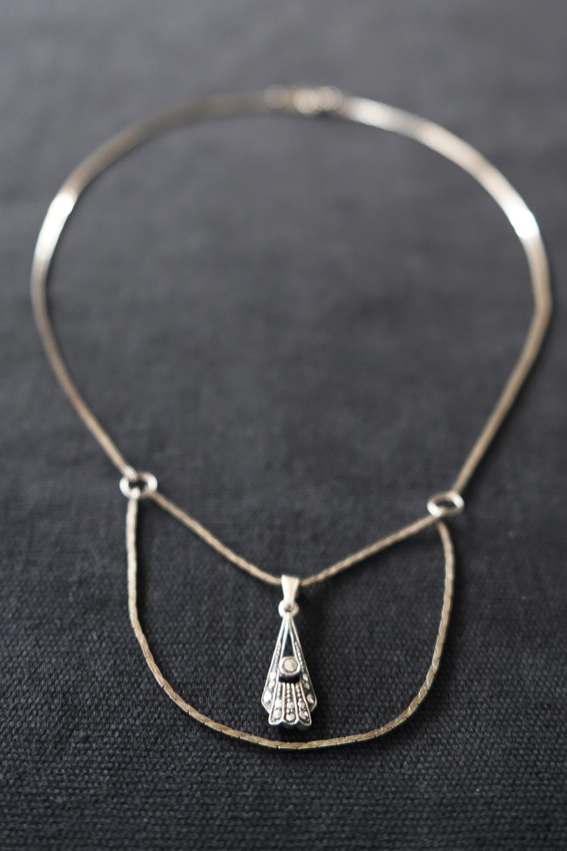 1940年代頃につくられたアールデコ・シルバーネックレス。2段になったチェーンやマーカサイトが綺麗です。