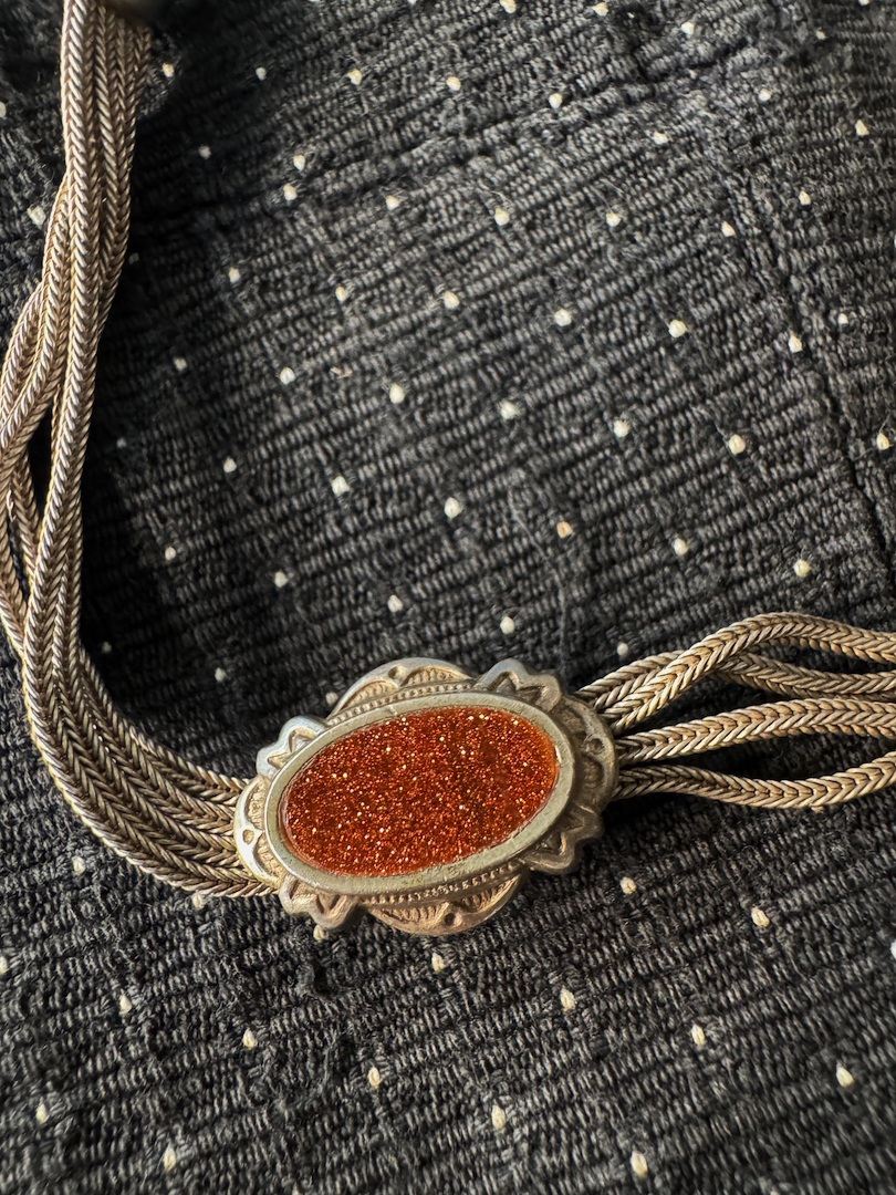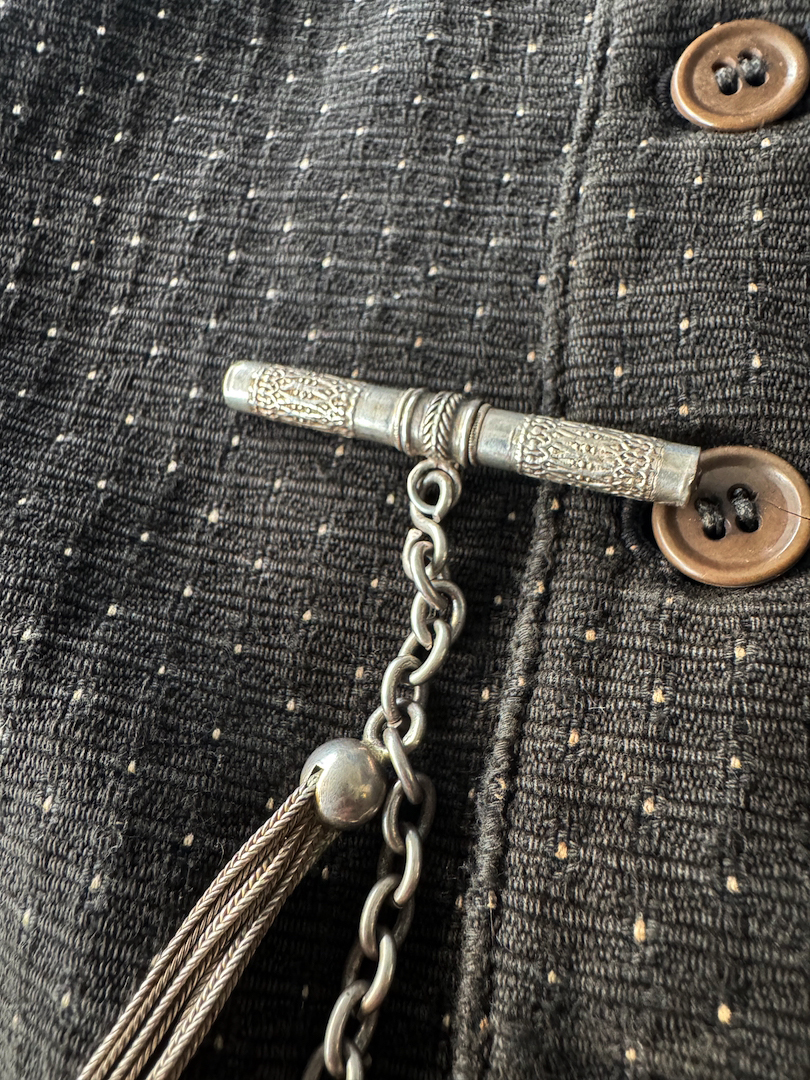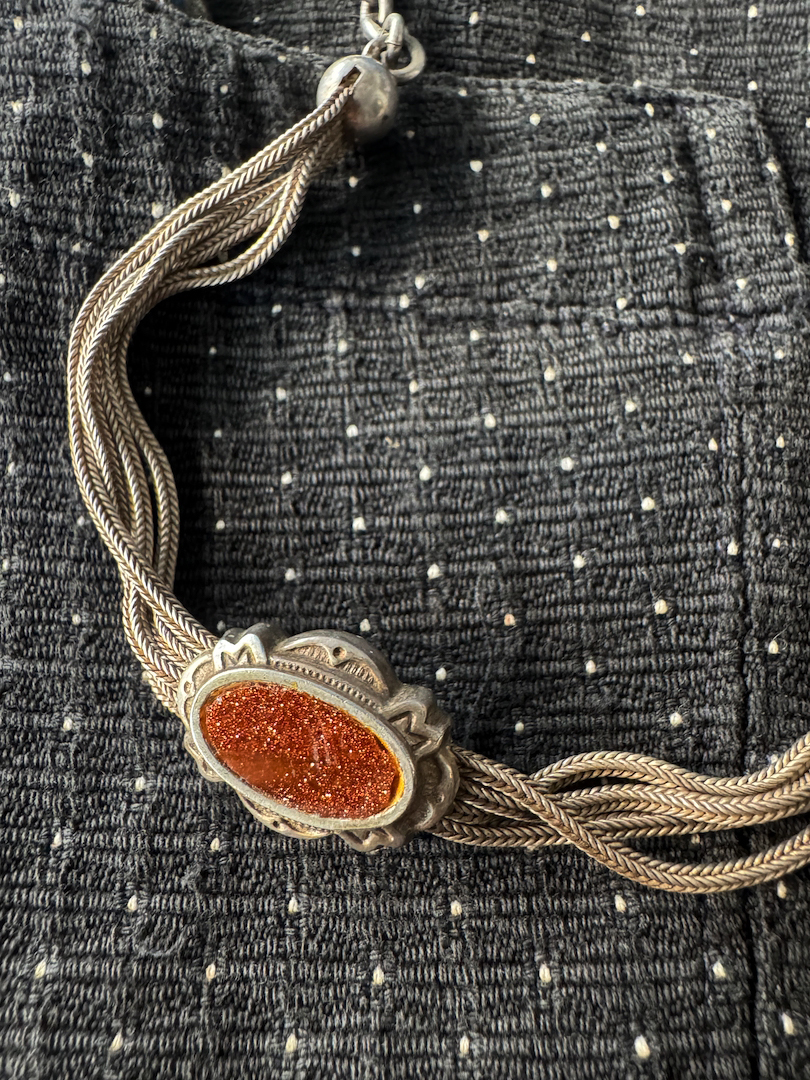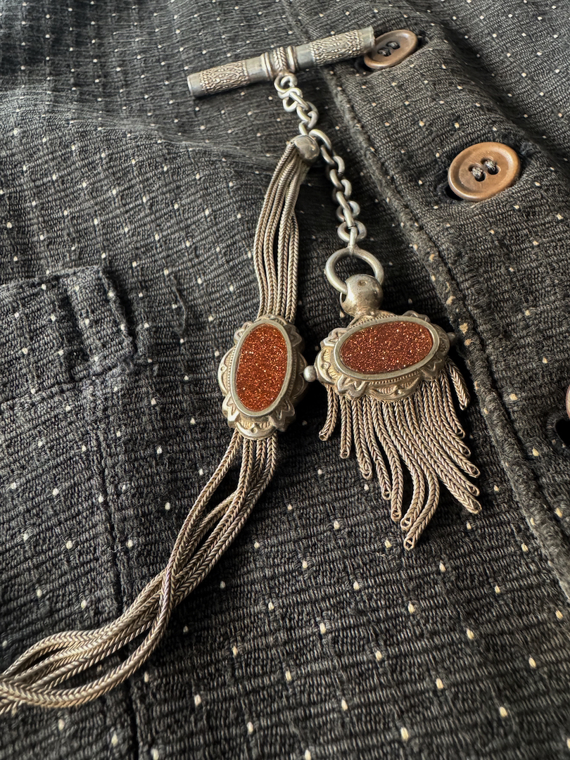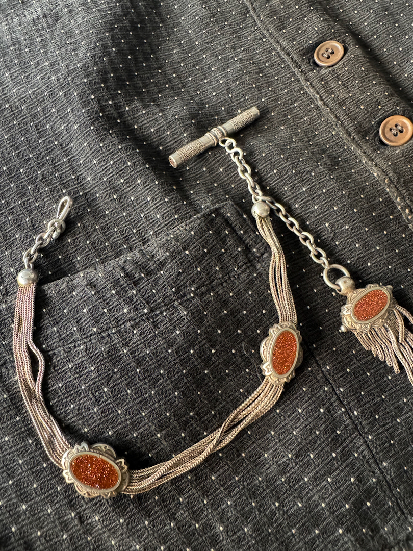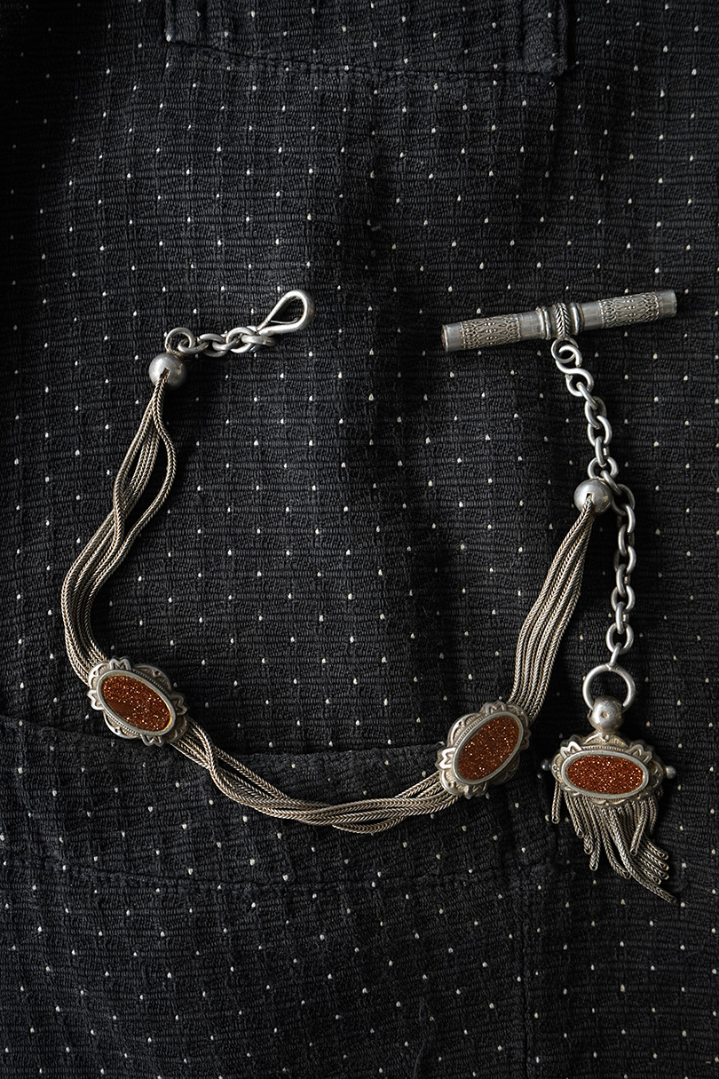 ゴールドストーン(人工ガラス)があしらわれたシルバーのウオッチ・チェーン。20世紀初期頃のものだと思います。