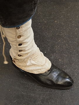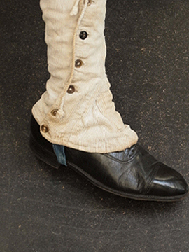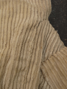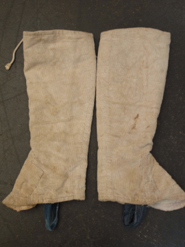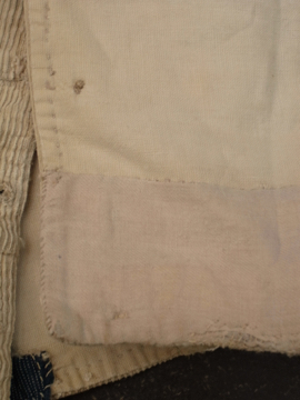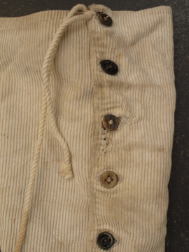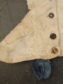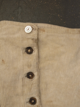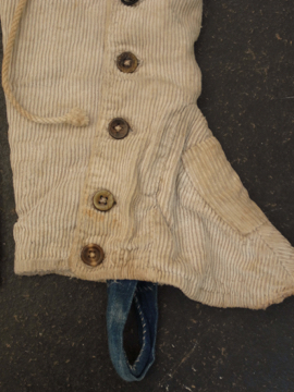 手縫いでつくられたコーデュロイ・ゲートル。1930年代以前ものだと思います。表は柔らかめのコーデュロイ素材、裏地はリネン地、ストラップはインディゴ染めのストライプ・コットン地、使われている素材が良いです。ボタンは骨、ガラス、貝、メタル等の様々なものがついており、ボタンホールは勿論手縫いです。直しや擦れ、汚れ等の経年の傷みはありますが良い風合いとなっています。