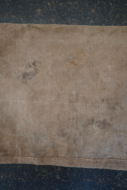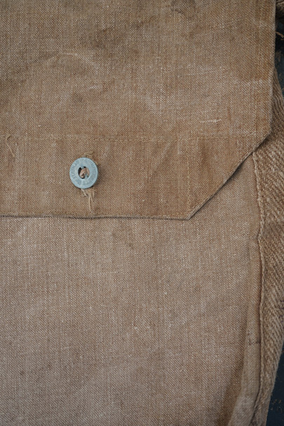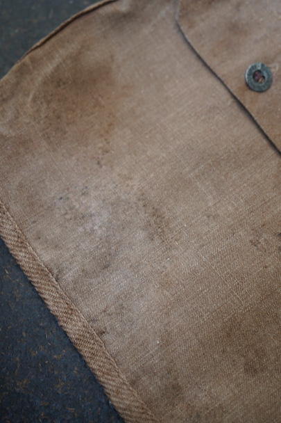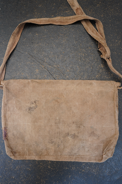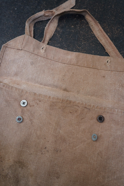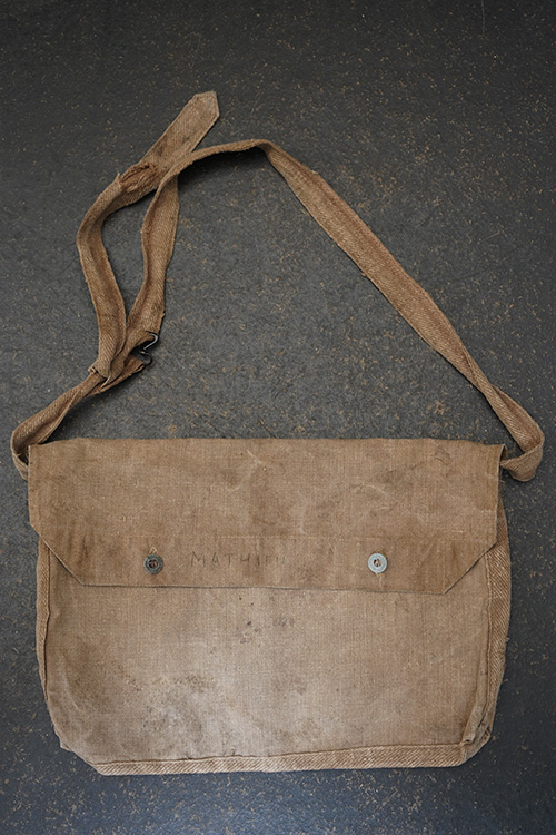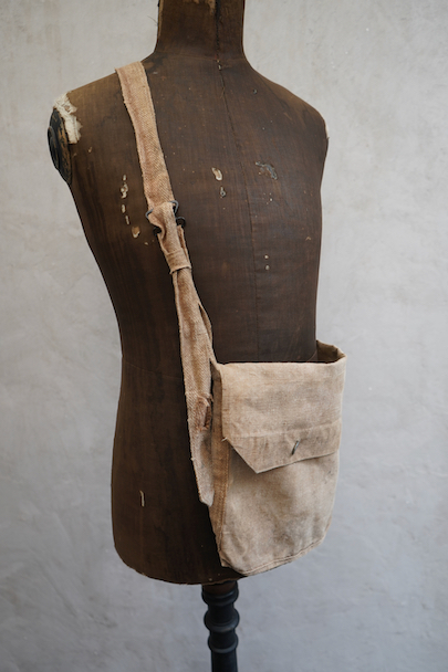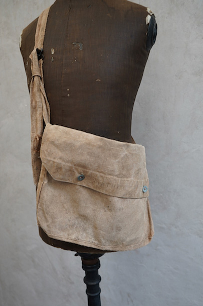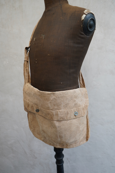 1930年代頃のミリタリーのショルダーバッグ。ブラウン・カラーの丈夫なリネン素材が使い込まれて、味わいのある質感です。EQUIPEMENT MILITAIRESのメタル・ボタンがついています。バックルでストラップを留め、長さを調節します。ストラップに穴、バック左に直し痕、ボタンホールにほつれ、全体的にシミがあります。使用感はありますが良い雰囲気のあるバッグです。