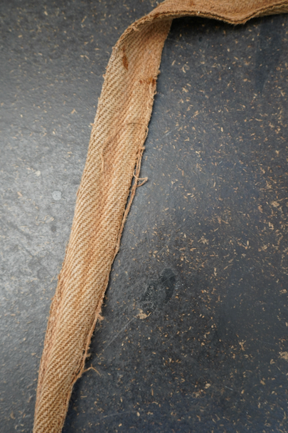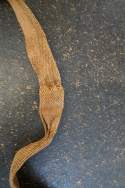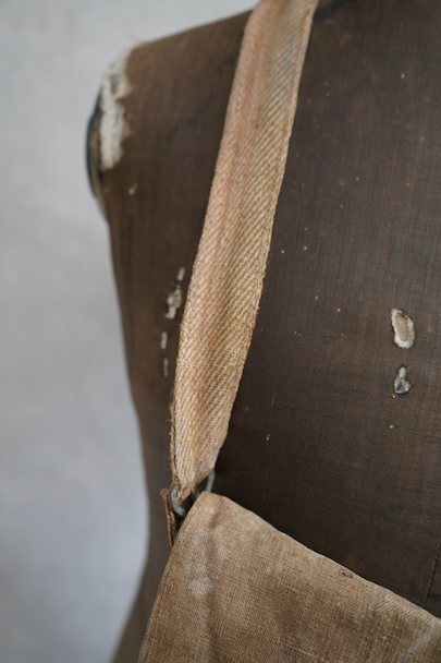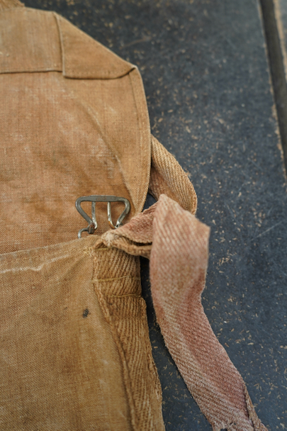 フランス軍のブラウン・リネンのブレッドバッグ。ストラップに2本挿バックルが付き、長さの調節ができます。バック内側上部にもストラップとバックルがついた珍しい仕様となっています。メタルボタン、手縫いのボタンホール。シミや擦れ、ボタンホールのほつれなどの経年のダメージがあります。