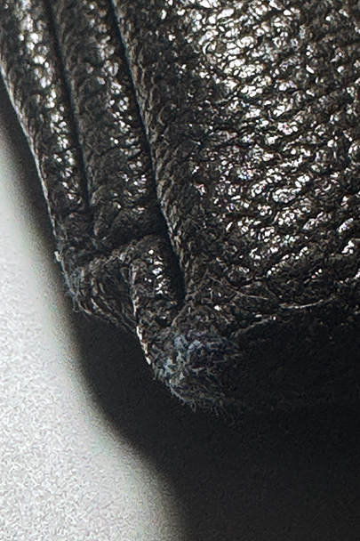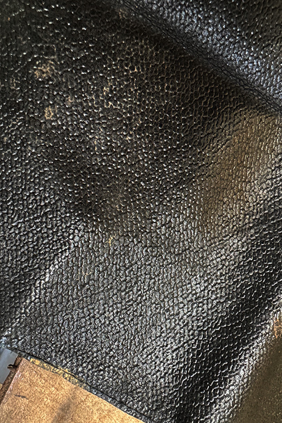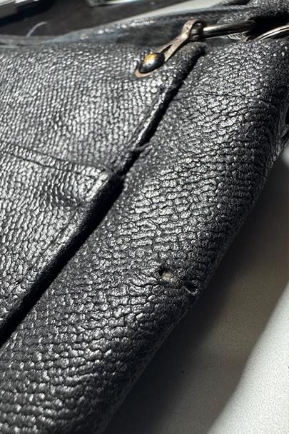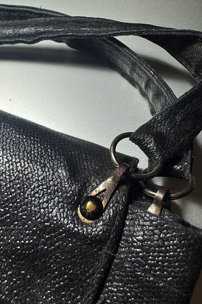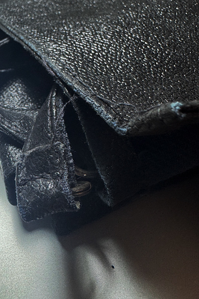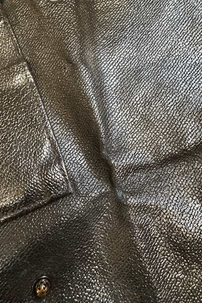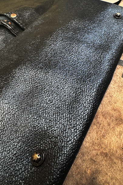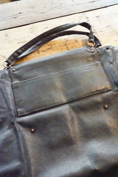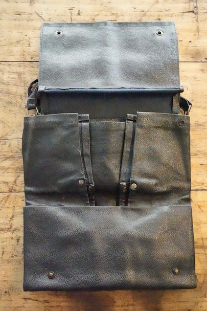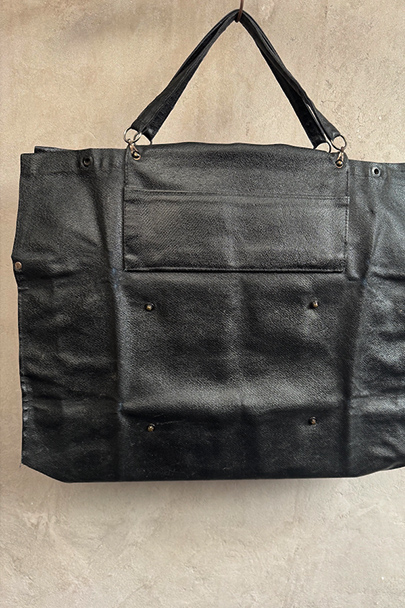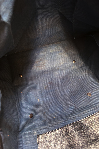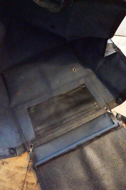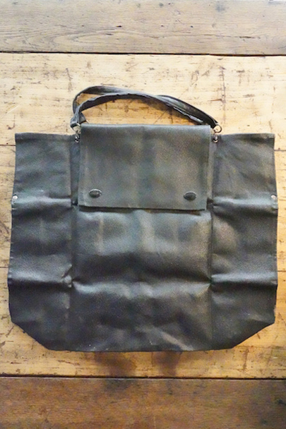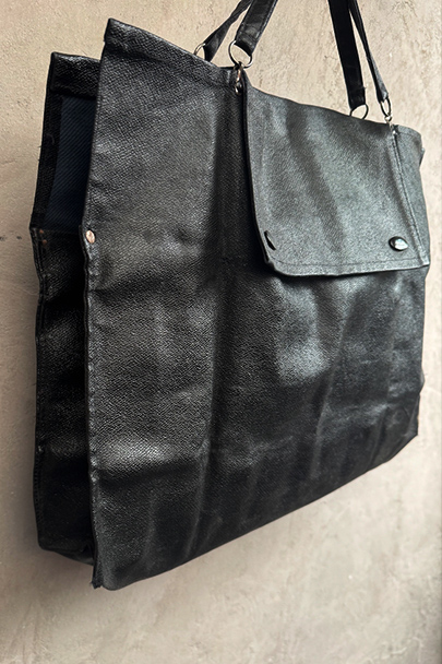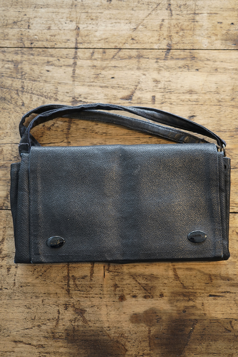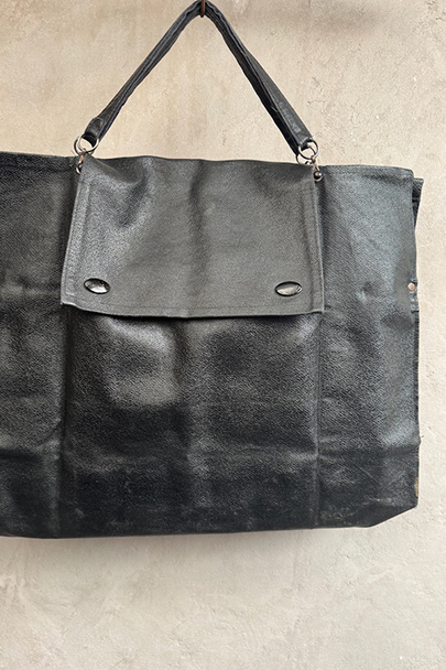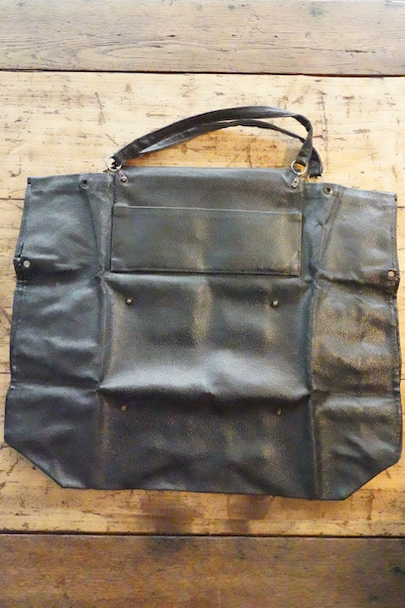 1930年代頃につくられた古い折りたたみできるバッグ。表が黒、内側が青い合皮素材です。畳むと裏に小さなポケットがついたハンドバッグのような形になり、開くと縦31cm、横43cm、8.5cmのマチ付きのバックになります。折り畳む際の折り目の角に擦れた傷み、蓋の裏側のポケット部分にほつれがあります。折りたたむ際、内側にスナップボタンを留められない部分がありますが、一番外側のボタンが留められるので使用には問題ないと思います。その他、小さい穴や汚れがあります。