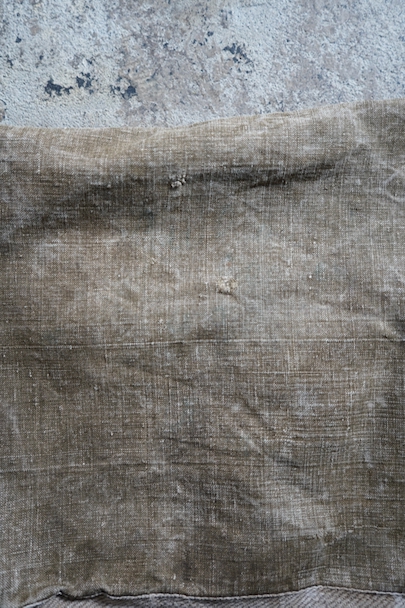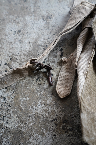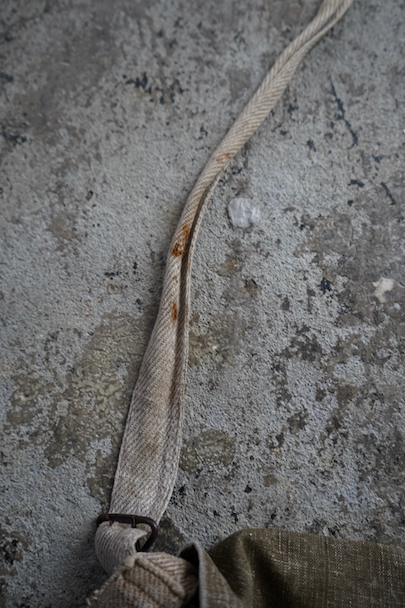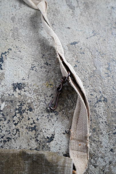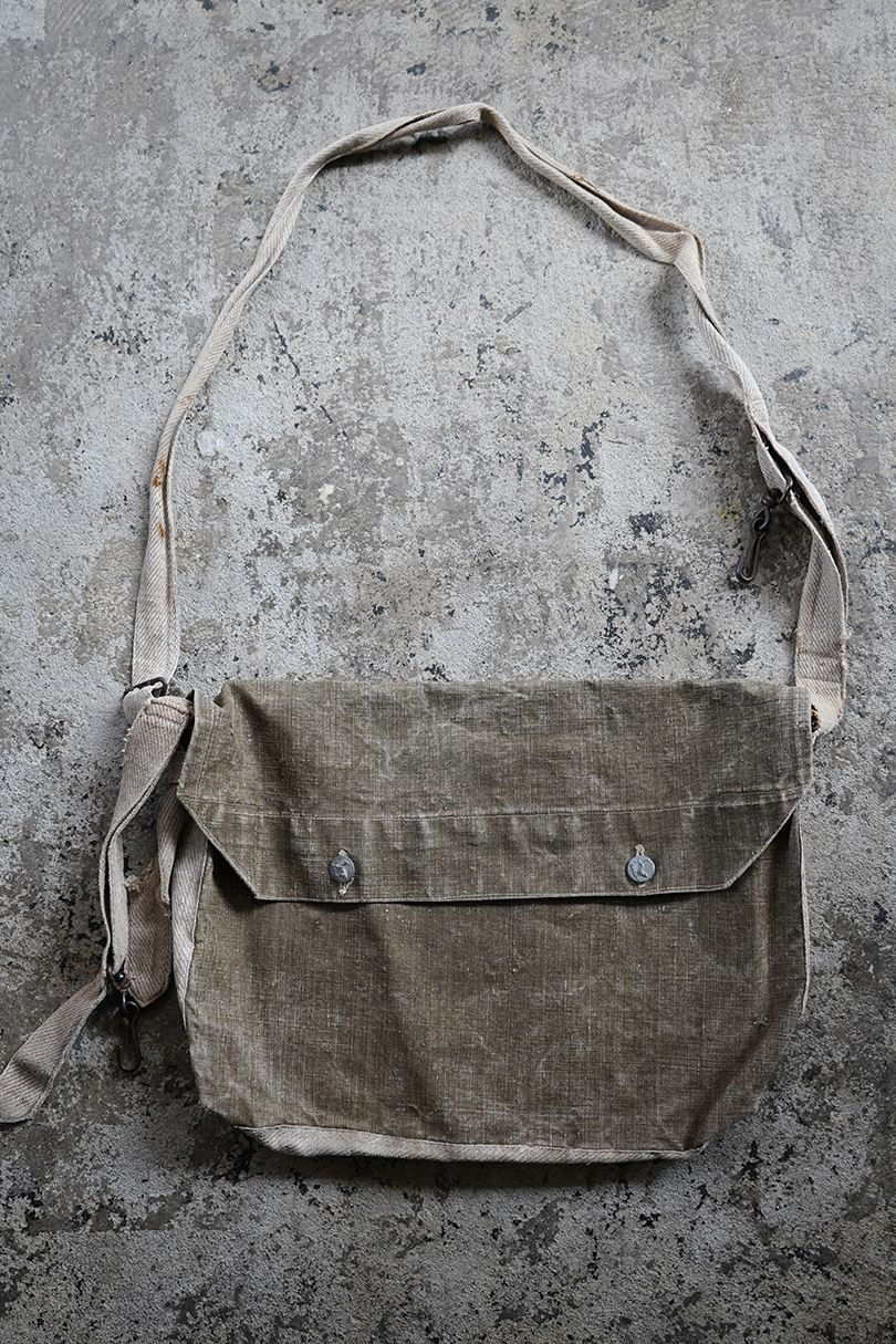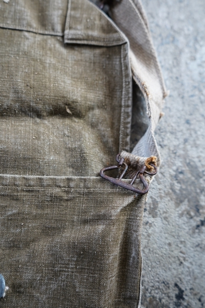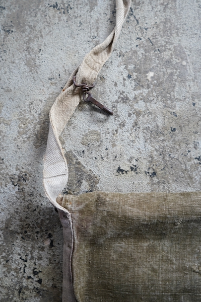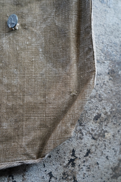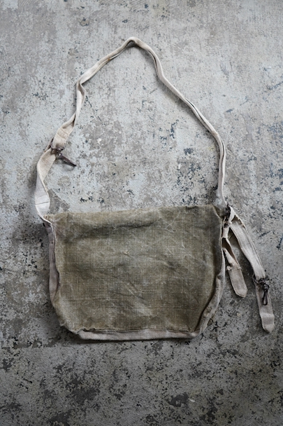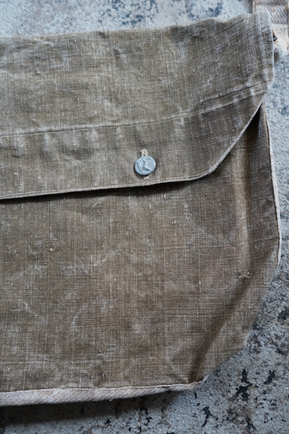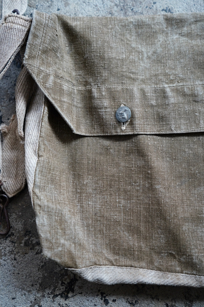 フランス軍のブレッド・バッグ。1940年代頃につくられたものだと思います。オリーブ・カラーのリネン素材、ボタンはハンティングようのものがつけられています。フックやバックルが多くついています。小穴や擦れ、ストラップにほつれ、シミがあります。