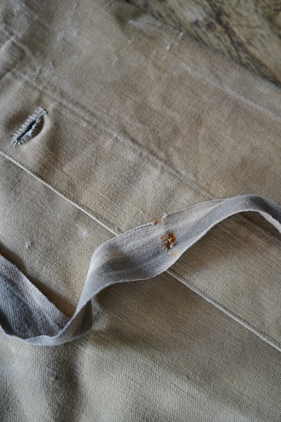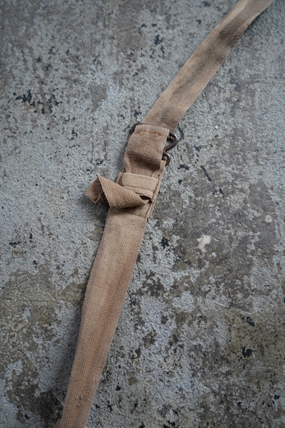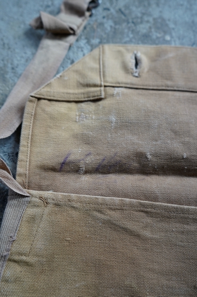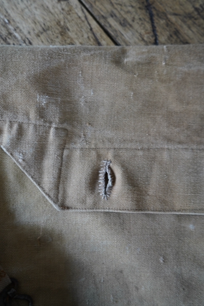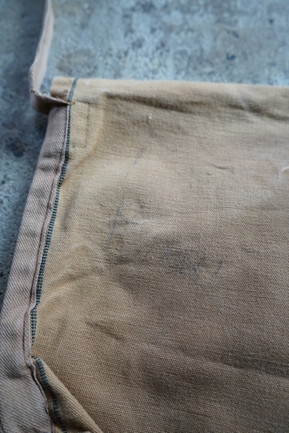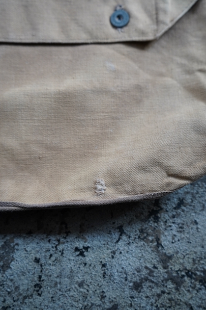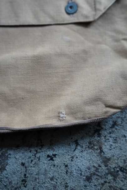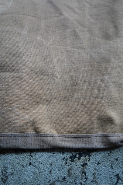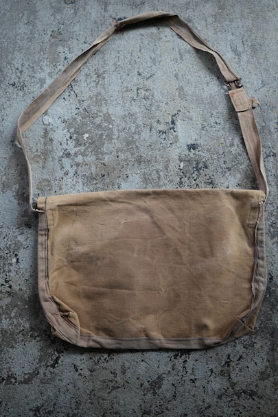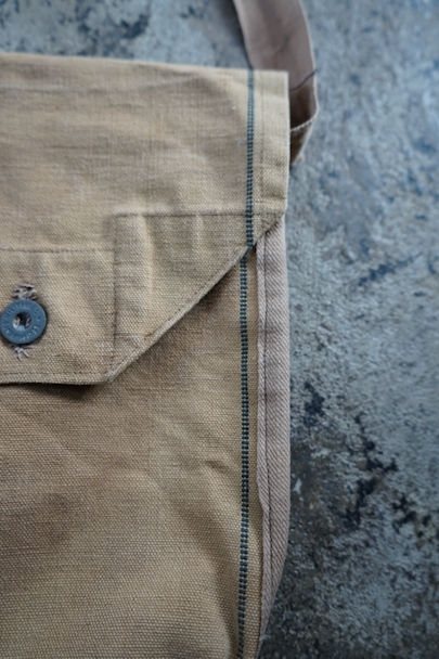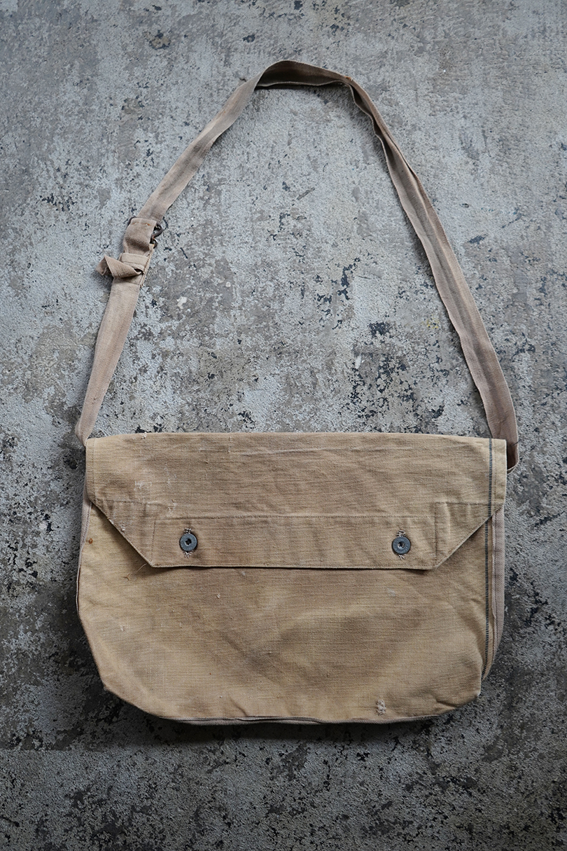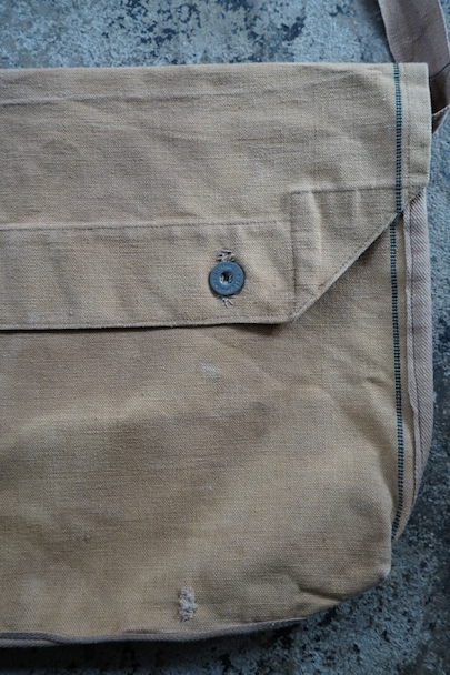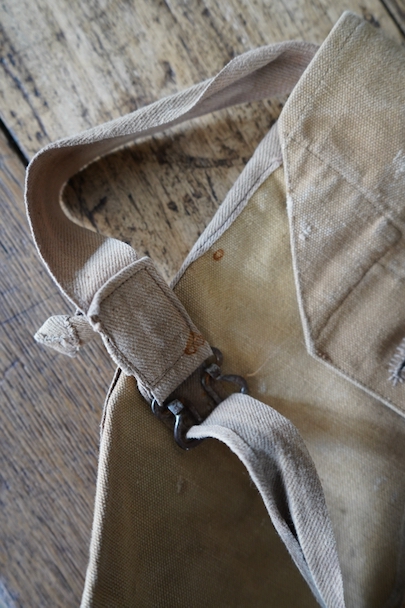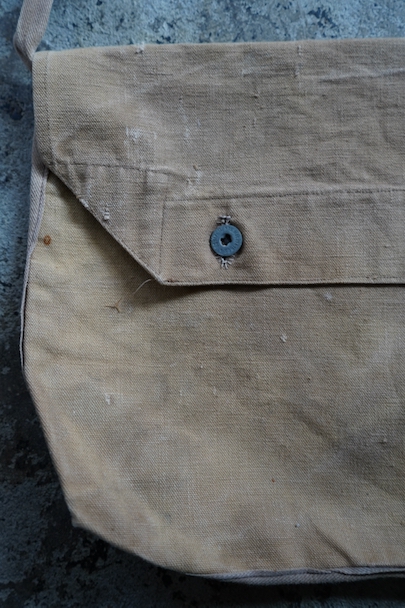 フランス軍のブレッド・バッグ。1940年代頃までにつくられたものだと思います。ベージュのキャンバス素材、コットン・リネンだと思います。MILITAIRES EQUIPMENTと記されたボタン。小さい直し痕、全体的にシミや擦れ、ストラップに穴があります。