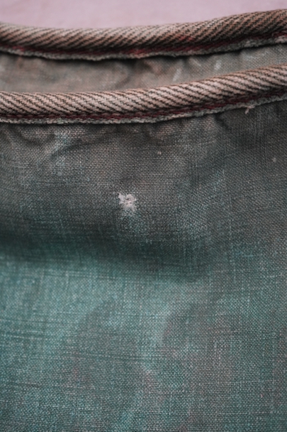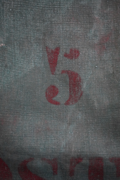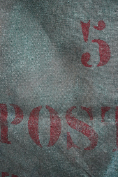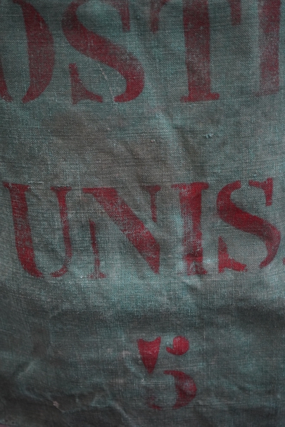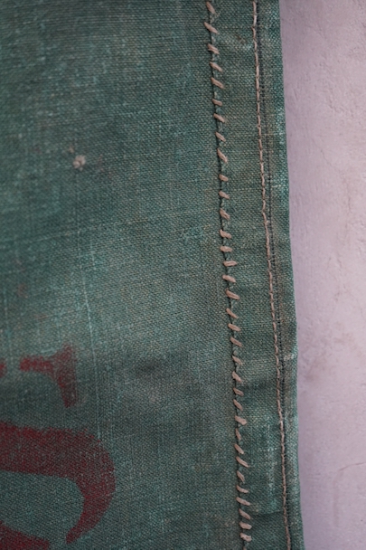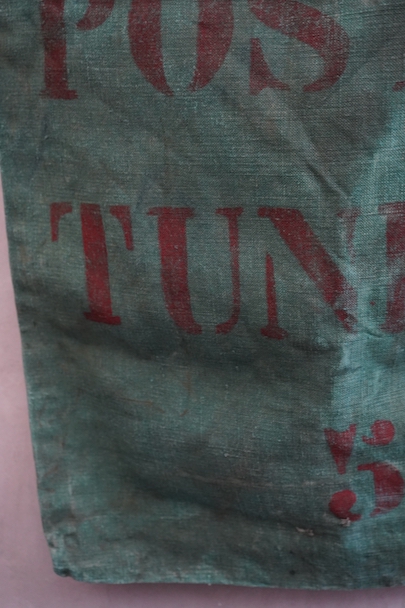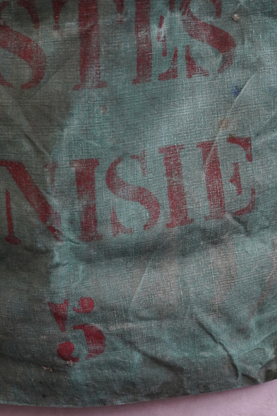 珍しいグリーンのフランス郵便局の麻袋です。しっかりとした厚い生成りのキャンバス素材、ヘンプだと思います。赤字で両面に"POSTES TUNISIE" とプリントされていますので、フランス領だったチュニジアで50年代までに使われたものだと思います。直し痕、擦れや穴、シミがあります。 洗濯済みです。