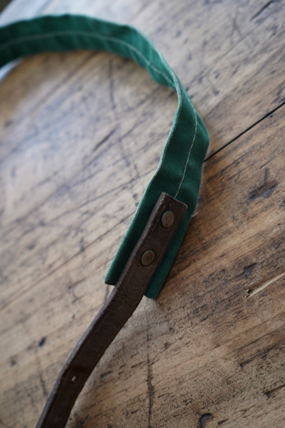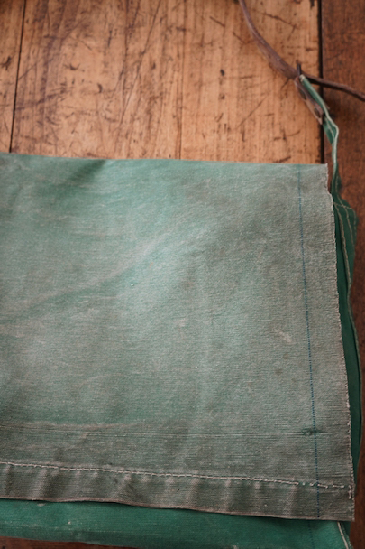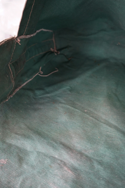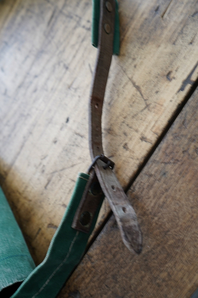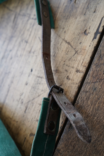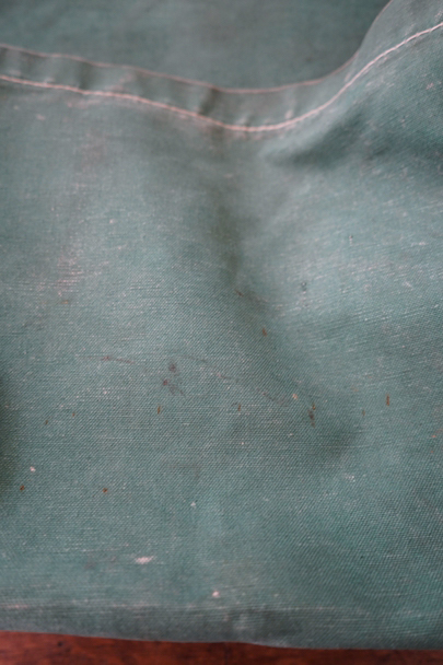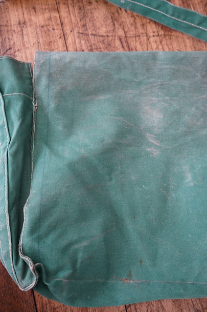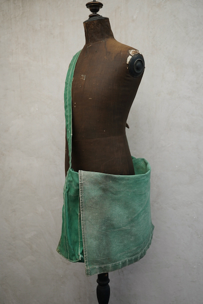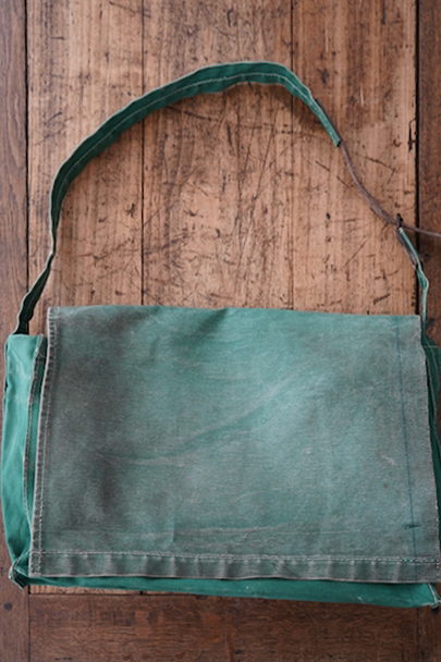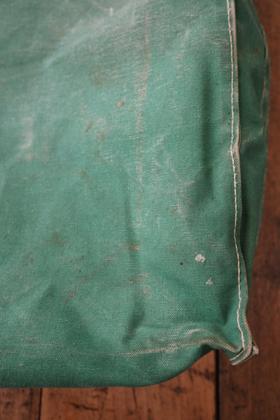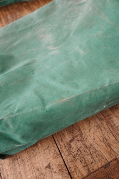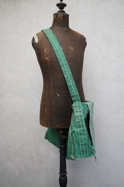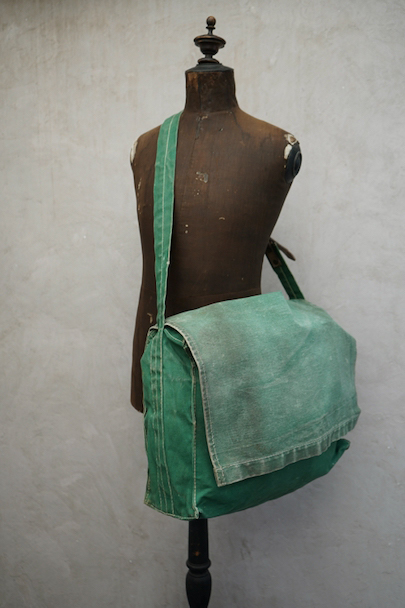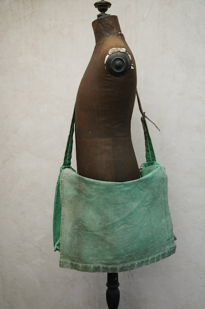 グリーンのコットン・キャンバス素材の大きなショルダーバッグ。20世紀中期頃のものだと思います。ストラップは部分的にレザーが使われていて長さの調節ができます。全体的にシミや擦れ、ほつれ、色褪せなどの経年の傷みがありますが、大きなダメージはなく状態は良好です。これくらいの大きなサイズのショルダーバッグは数が少ないです。
