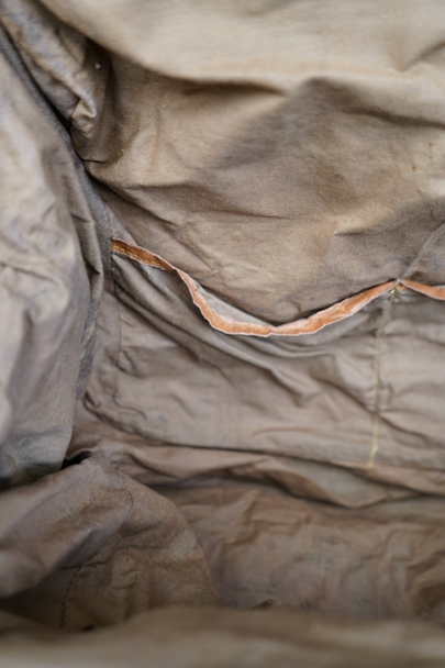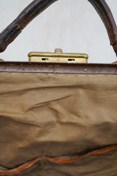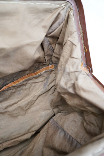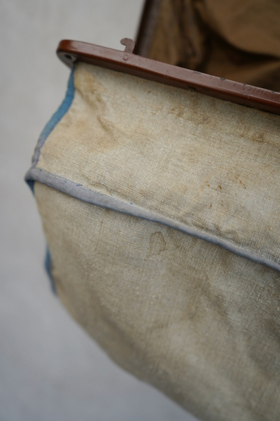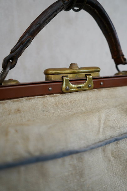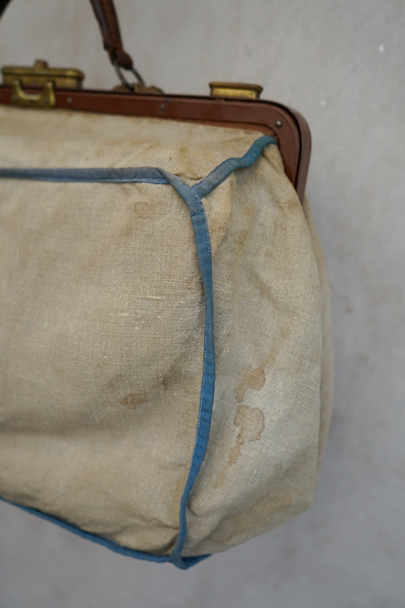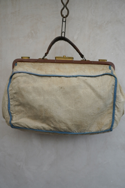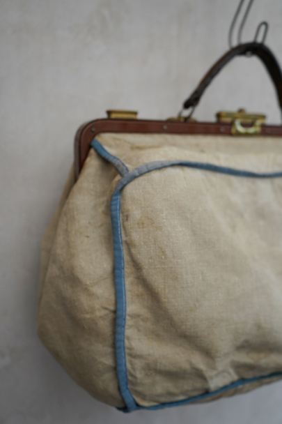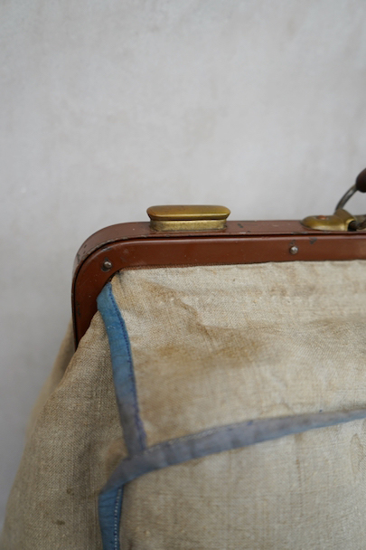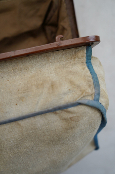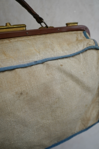 20世紀初期頃につくられたリネンの布地で表面が覆われたバッグ。ブルーでパイピング処理されています。トップの鍵はありません(開閉はできます)。口の左右の留め具を外側にスライドさせ、中央の鍵のついた部分を右にスライドすれば開きます。汚れやシミはありますが、破れなどはなく状態は良好です。