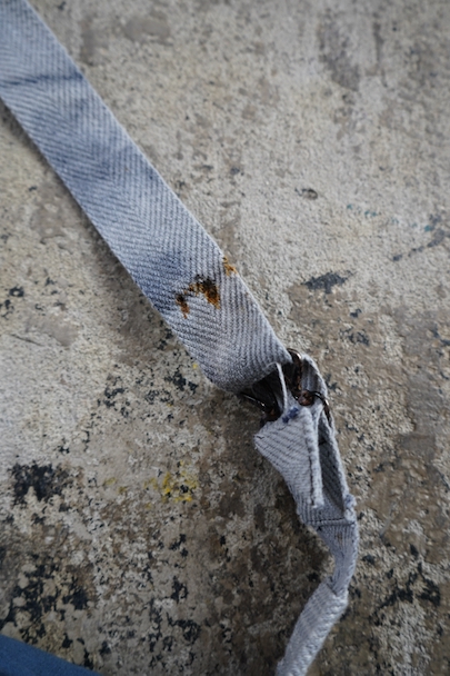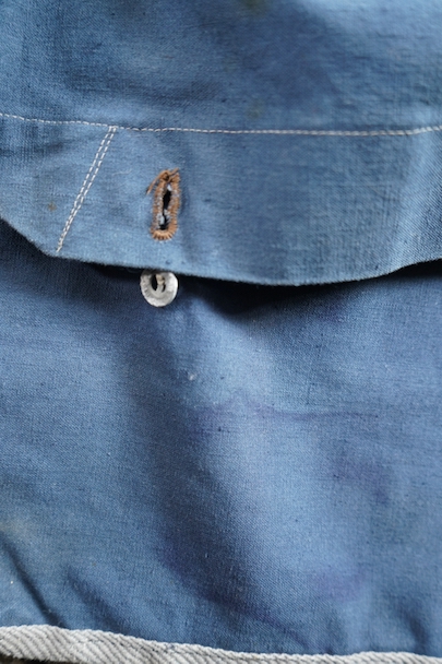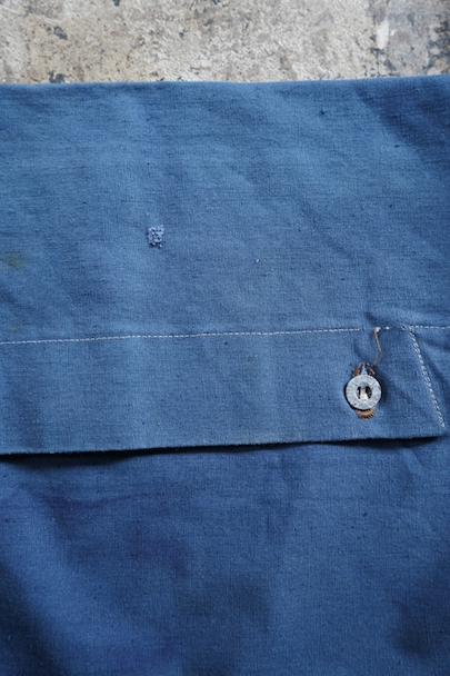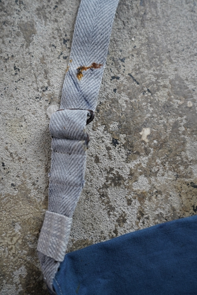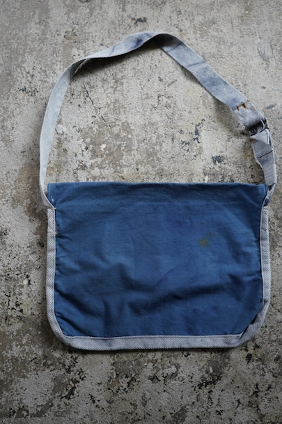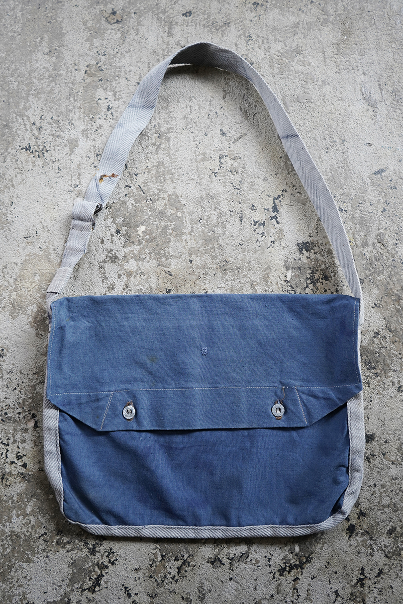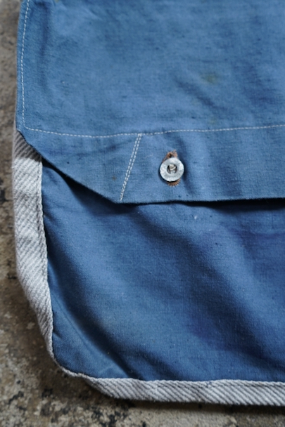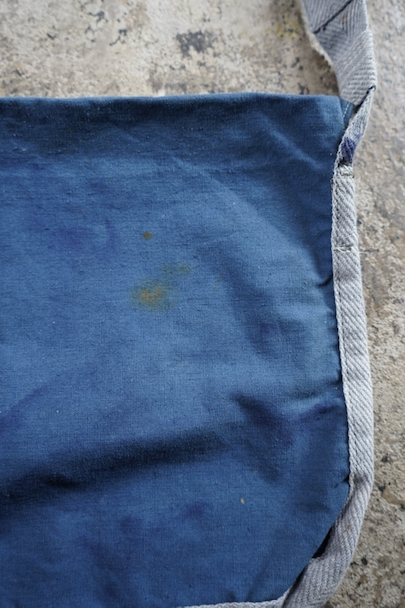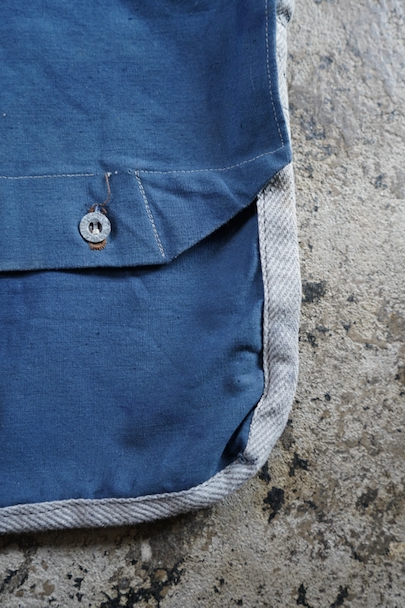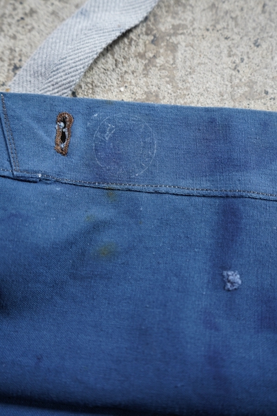 珍しいブルー・コットンのフランス軍のブレッド・バッグ。1940年代頃までにつくられたものだと思います。MILITAIRES EQUIPMENTと記されたボタン。小穴、全体的にシミや擦れがあります。