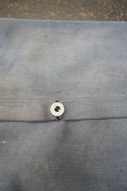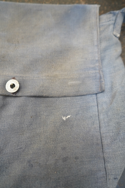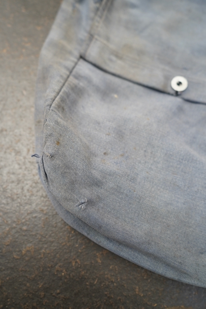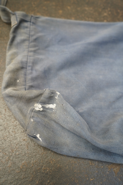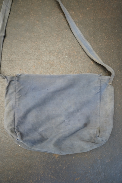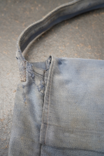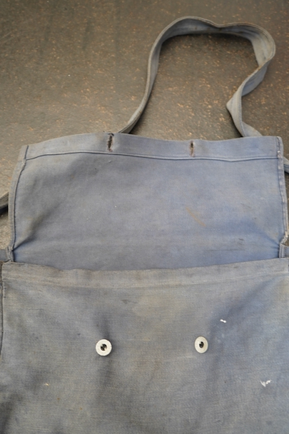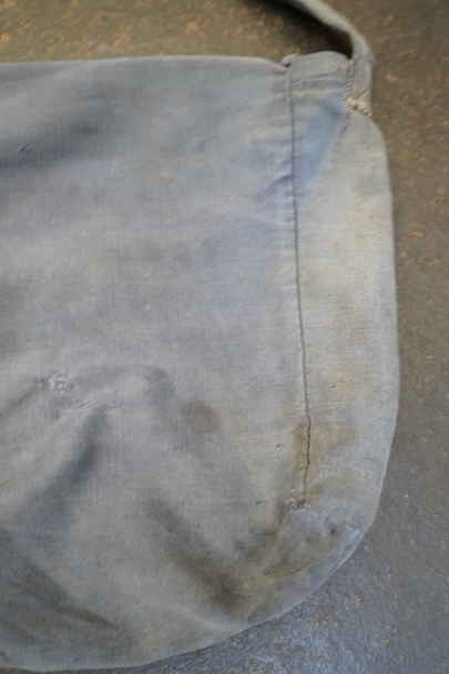 ブルー・モールスキン素材のミュゼット。1930年代から1940年代頃につくられたものだと思います。モールスキン素材のものは珍しいです。フランス軍のボタンがついていますが、スタンプ等はありません。全体的に塗料汚れやシミ、傷、直し痕があります。