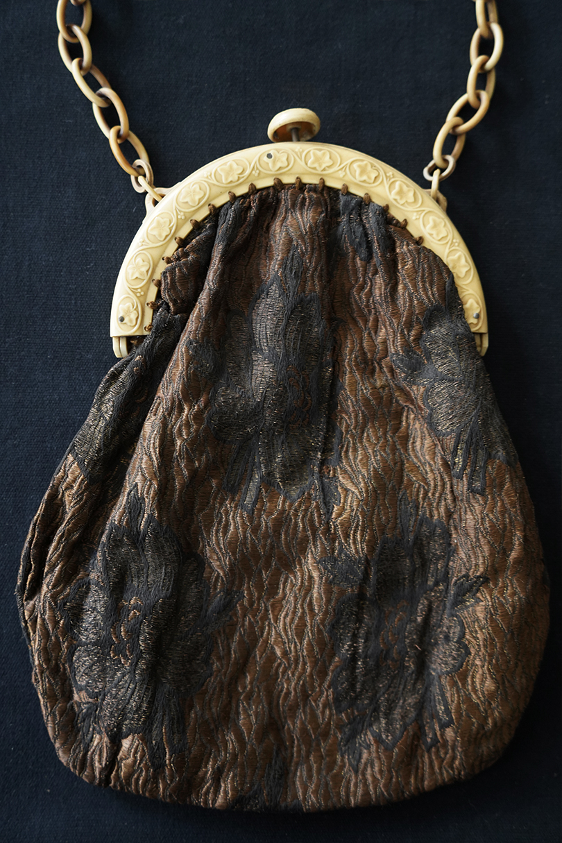 1920年代から1930年代頃につくられた小ぶりなバッグ。メタルの花織柄が美しい布地にセルロイドの留め具が付いています。内側のシルク生地も華やかで美しいです。裏地に裂け、表地に若干の擦れがあります。