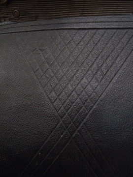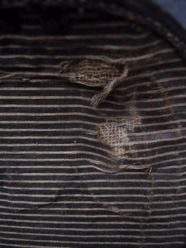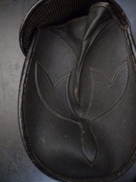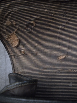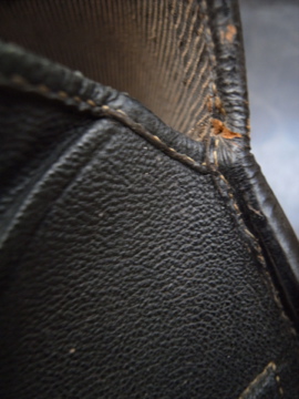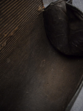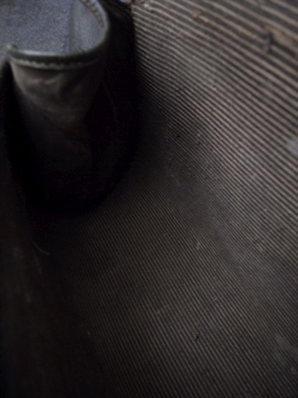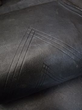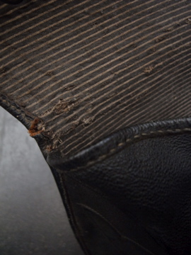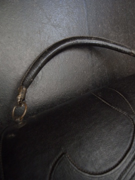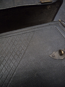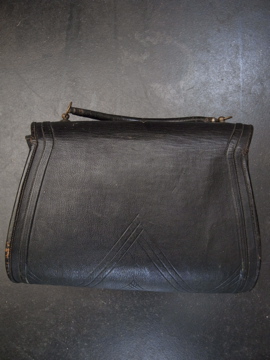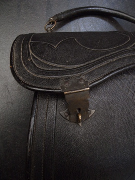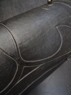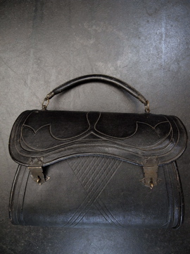 1830年から1850年代頃につくられたレザーハンドバッグ。柄の型押しやステッチが入ったレザーは堅くしっかりとしたつくりで、内側にはストライプの布の裏地が貼ってあります。曲線の美しいフォルムは勿論、留め具の形など細部もフランスらしさを感じさせるとても良い品物です。内側の布地に破れがあります。小さな穴やスレなど全体的に経年の傷みがありますが、年代を考えると非常に状態は良いです。実用可能ですが、アンティーク品のため、取り扱いにはご注意ください。