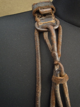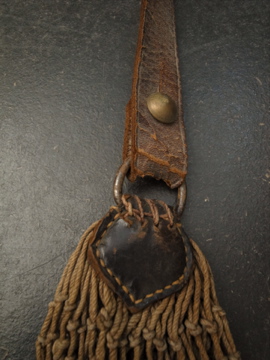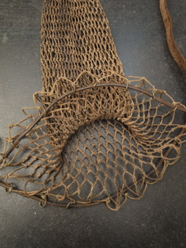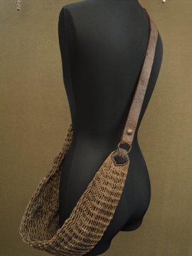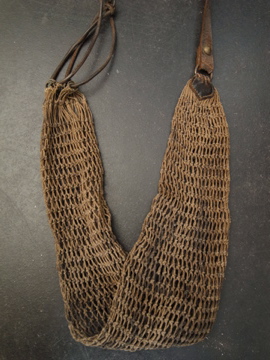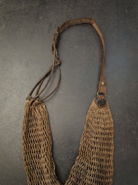 ハンティング/フィッシング用のメッシュ・バッグ。おそらく19世紀後期から20世紀初期頃までにつくられたものだと思います。ここまで古いものは稀少でつくりや素材に趣があります。全体的に汚れ、金属部分に錆があります。レザー部分には亀裂が見られますが、ストラップ部分のレザーは柔らかさもあり実用に問題はないと思います。しかしながらとても古いもののため、使用の際は十分ご注意ください。使い込まれた味があるとても良い雰囲気のある品です。