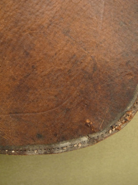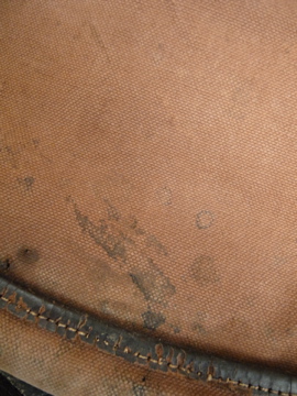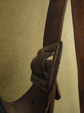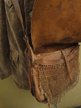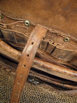 1920年から1930年代頃につくられたレザーのハンティングバッグ。ダメージがありますが風合いの良いバッグです。内側にはコットンのポケット、獲物を入れるためのネットのポケットがついています。全体的に傷みがあり、縫製にほつれ、皮が硬くなった部分があります。ネットに穴や仮留めしたような直し、ネットポケットを留める部分とストラップを留める部分に針金を使って直された部分があります。特にストラップ部分には縫った直しもあるためそのままどれくらい使えるかわかりません。補強したり手直ししながらご愛用いただけたらと思います。