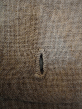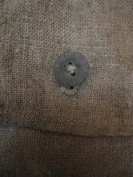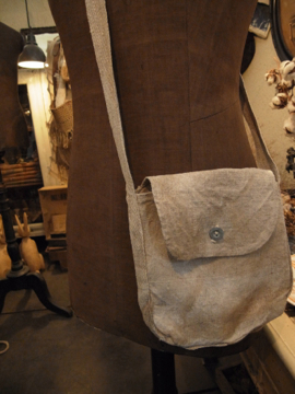 生成りリネンのミリタリー・ショルダーバッグ。20世紀初期頃、第一次大戦頃までのものだと思われます。通常のブレッドバッグのハーフサイズという珍しい形、そしてこの色は、とても珍しいです。ボタンは4つ穴のメタルボタン、ボタンホールは手縫い。全体的にいい具合に黒ずみやシミがあり味があります。破れ等はなく実用できます。