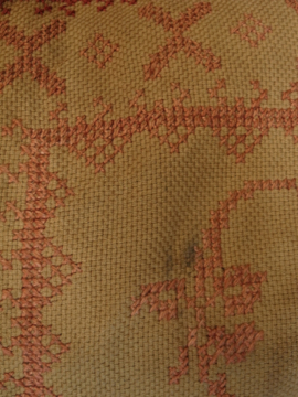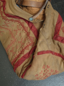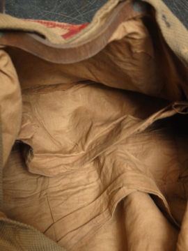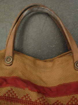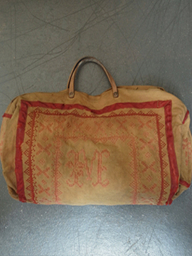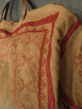 20世紀初期頃につくられたバッグ。コットン地に細かく赤い手刺繍が入った品。赤いテープ部分はウールです。内側に大きなポケットが2つ。赤いテープに裂け、擦れ、穴、破れやほつれがあり、全体的にシミがあります。かなりの使用感がありますが、良い味があります。この手のバッグにしては大きめで使いやすいサイズです。