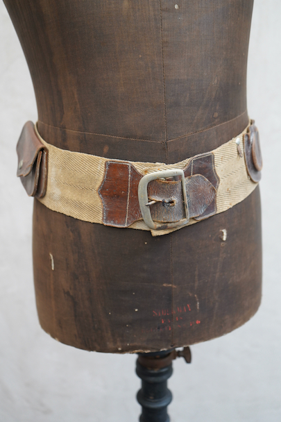 懐中時計用のポケットと小銭入れが付いたサイクリスト・ベルト。1940年代頃までにつくられたものだと思います。 レザーとベーっジュのベルトの風合いが良いです。伸縮性はありません。フロントのレザー部分の穴が裂けたのが縫い留めて直されっています。コインケースの蓋にひび割れ、ベルト部分に汚れ、ほつれを治した痕があります。このタイプにしては珍しい大きめのサイズです。