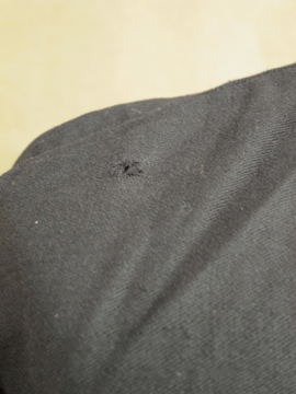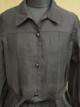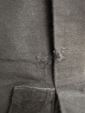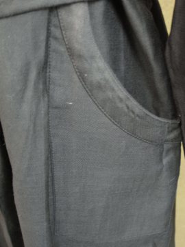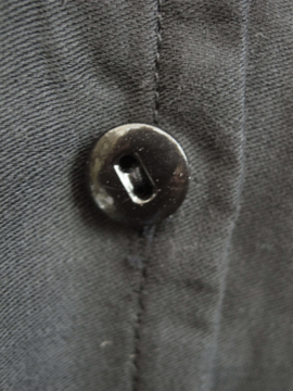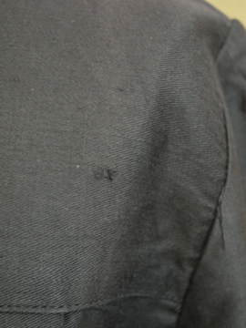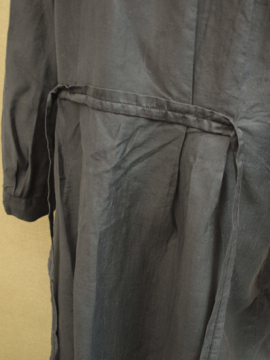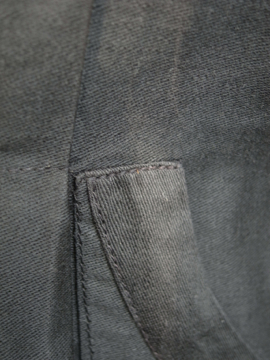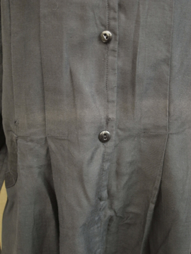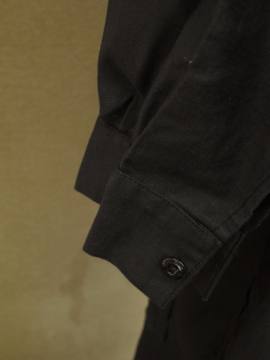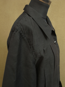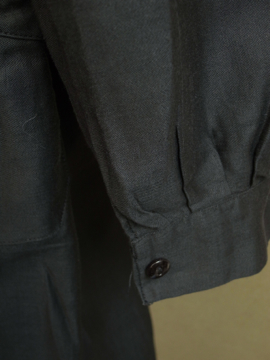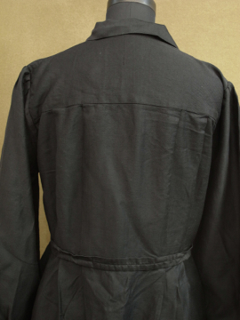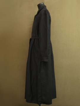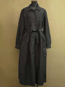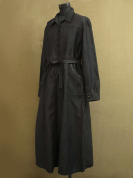 1930年代から1940年代頃につくられたワークドレス。程よいハリと光沢のある良いコットン素材です。フロントはウエストまでボタン留め、サイドついた大きなポケットが便利です。バックのウエストラインにベルトが縫い付けられています。ボタンは全てガラス製です。あまり使用されていないような素材感ですが、ウエストラインを中心に色むら、右ポケット上に1cmの直し痕、右肩に0.5cmの穴、そのほか擦れや小さな穴など多少の傷みがあります。