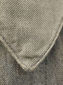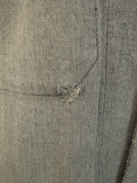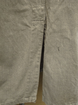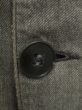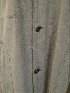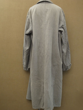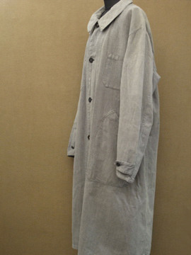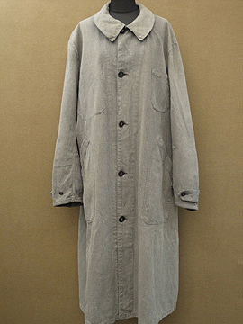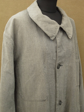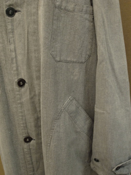1930年から1940年代頃につくられアトリエ・コート。褪せた色がきれいな綾織りのごま塩コットン素材です。大きめの丸い襟がフランス・ワークらしくて良いです。袖口にはタブがついています。全体的にスレ、穴、直し痕、色ムラがあります。ボタンが一部付け替わっています。全体的に経年の傷みがありますがとても良い味になっています。ダメージを気にされない方にお勧めいたします。