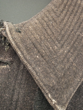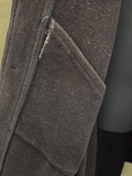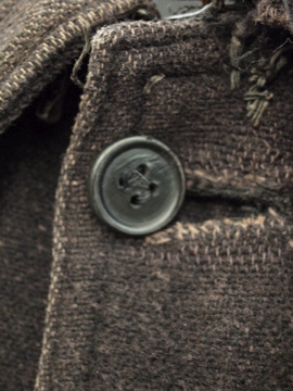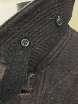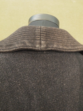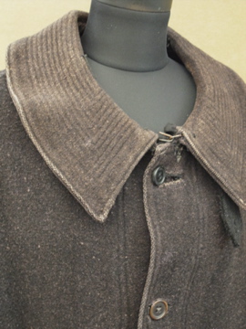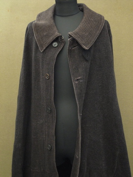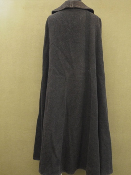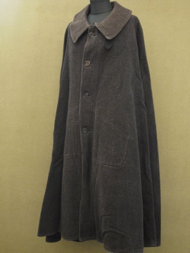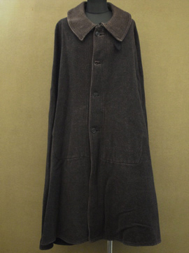 20世紀初期頃につくられたウール・ケープコート。重厚なウール素材はとても良い風合いです。大きな襟に入ったステッチが細かく美しい。内側ウエストあたりにポケットがついています。長さもありとても温かいです。ボタンホールに傷み、2mmから5mm程の穴が3カ所、その他、スレや色褪せ等、経年の傷みがありますが、時代を感じさせるとても存在感のある品です。元々は男性用ですが性別を問わず着ていただけると思います。古いものがお好きな方にお勧めです。