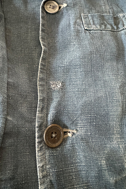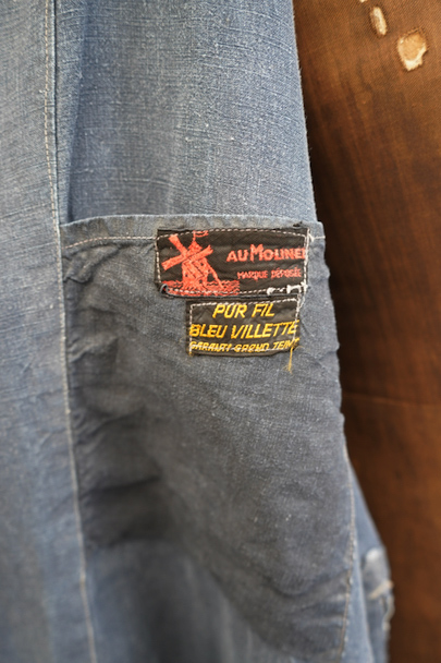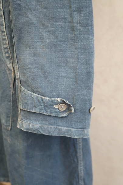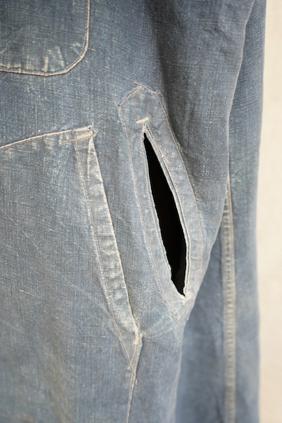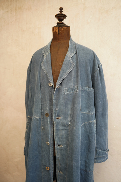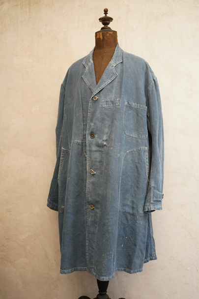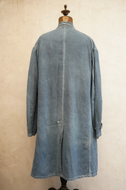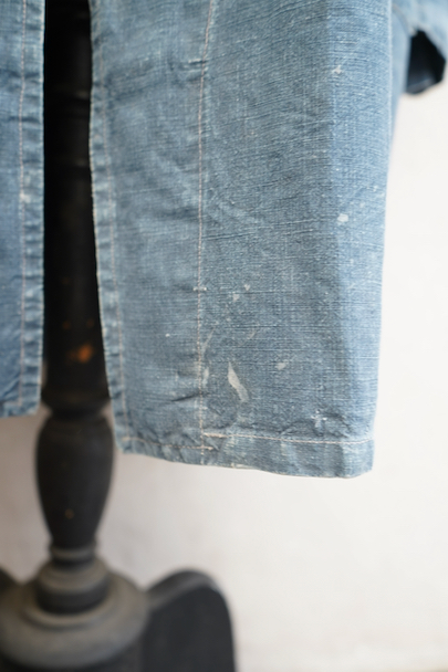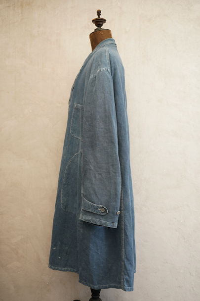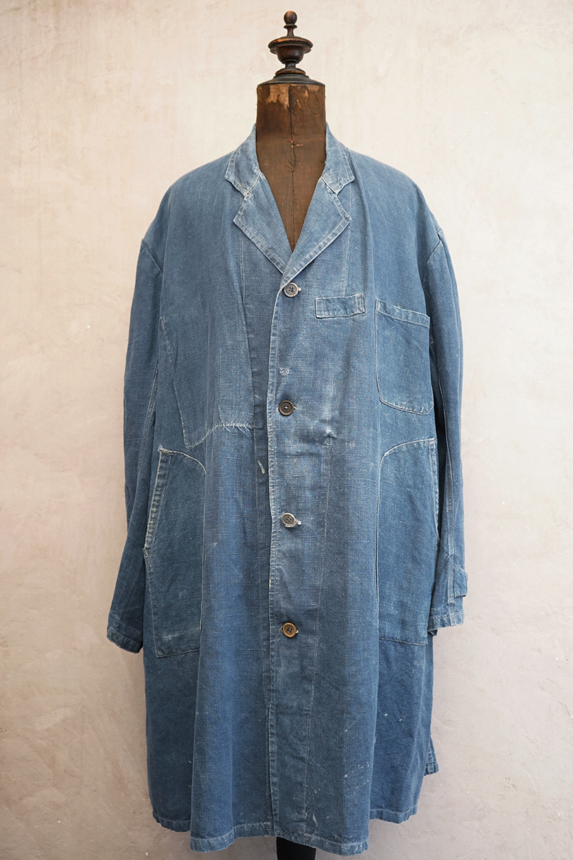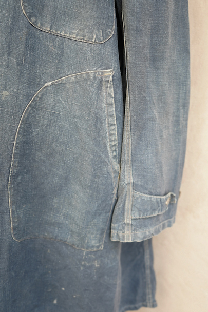 1940年代から1950年代頃につくられたインディゴ・リネンのワーク・コート。マキニョンという家畜の仲買人などが着たものです。"Au Molinel"製。細いリネン糸を高密度で織った弾力のある薄い布地でつくられています。使い込まれて良い具合に色が抜けています。胸に2連のポケット、こちらは長いハサミをいれるポケットがセットインになっています。下方左右に大きなD型のポケット、その外側にコート中にアクセスできるように開きがあります。袖口にはタブ。フロント中央に1.5cmの直し後、左右のポケットの口部分に穴、その外側の開きの端に裂けがあります。全体的に白い塗料のような汚れ、多少の擦れ等の経年の傷みがあります。