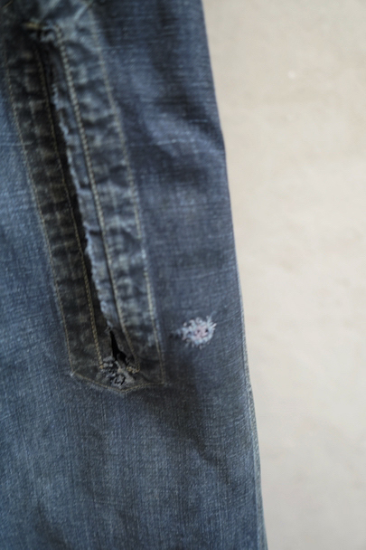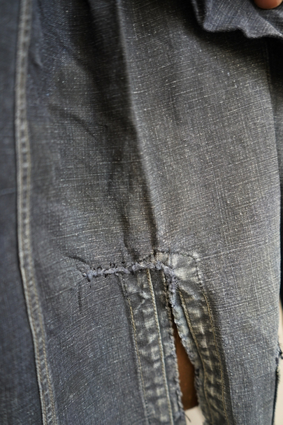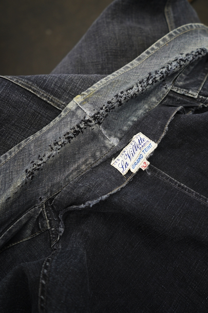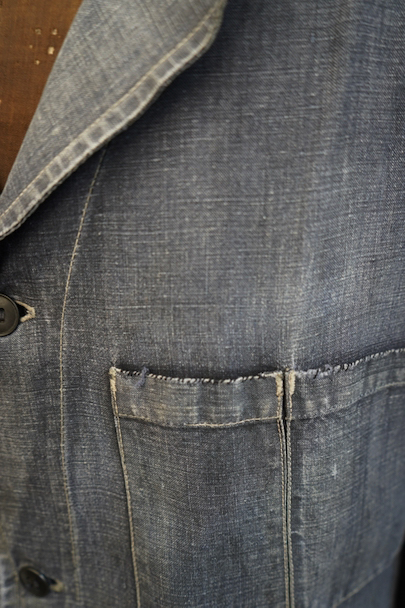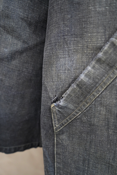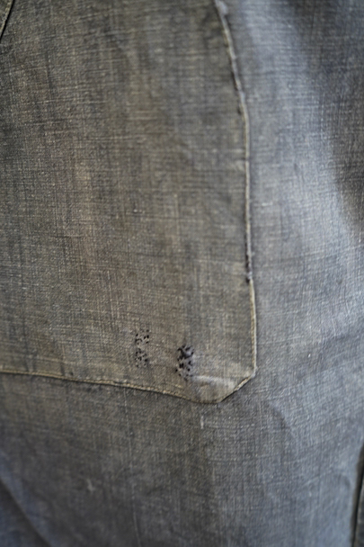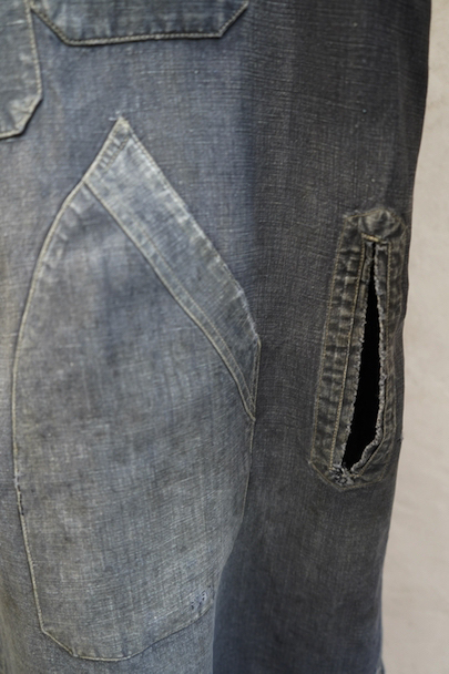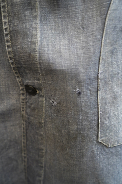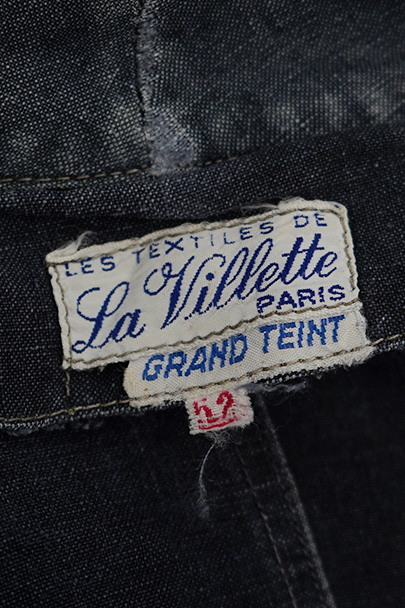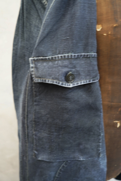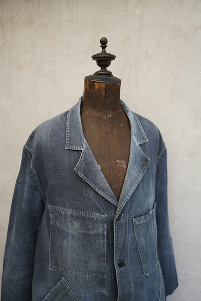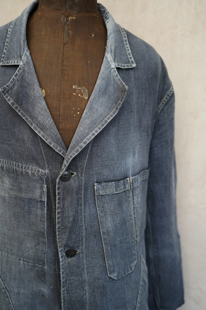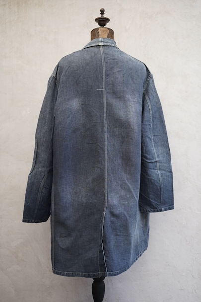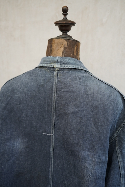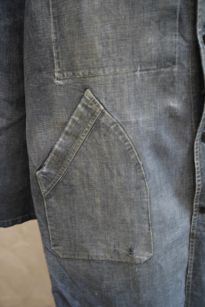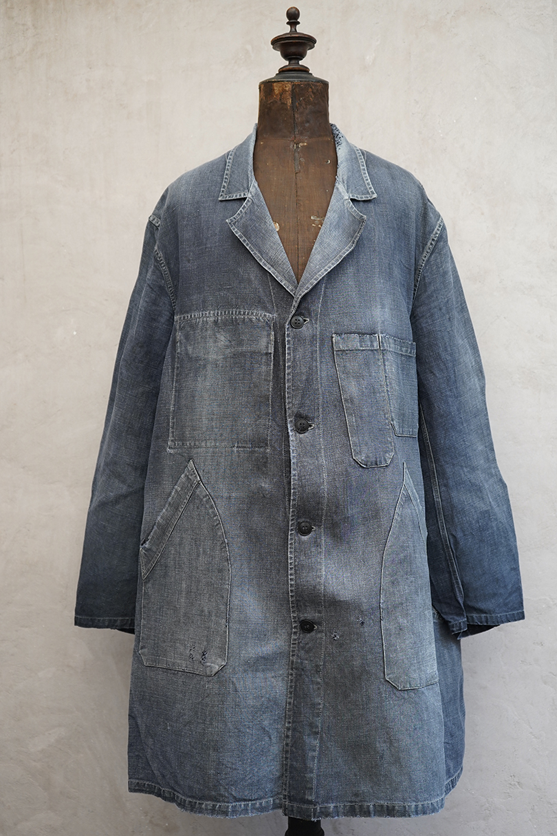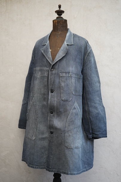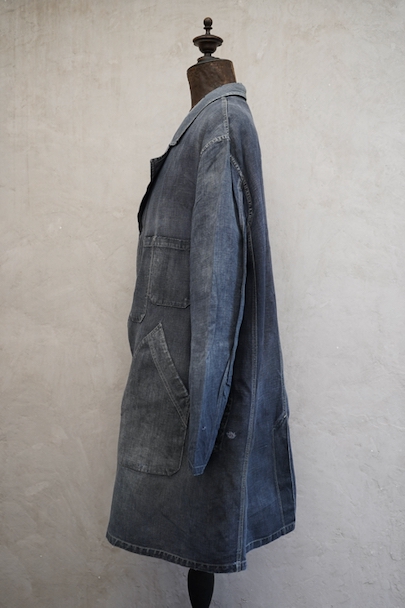 1940年から1950年代頃につくられたマキニョン・コート。使い込まれてブルー・グレーに色落ちした黒リネン素材、くたっとした良い風合いでオーバーサイズで着ても良いです。胸にハサミ用を含む2連のポケット、下方左右に大きなパッチポケット、その外側にはコート中にアクセスする貫通ポケットもあります。ボタン留めのフラップのついた内ポケットがあります。襟内側に擦れたダメージを直した痕、右の貫通ポケット上部やバック上部に裂けを直した痕、その他、ポケット周辺などに直し痕が多くあります。色褪せ、擦れ、シミ、小穴、ほつれ等がありますが、元々比較的しっかりとした生地なのでまだまだご愛用いただけると思います。