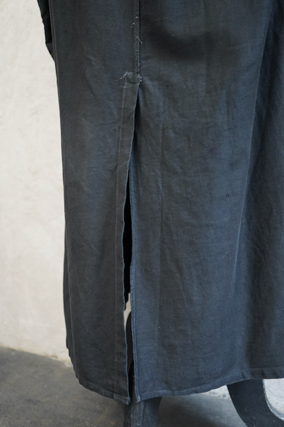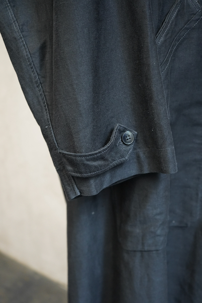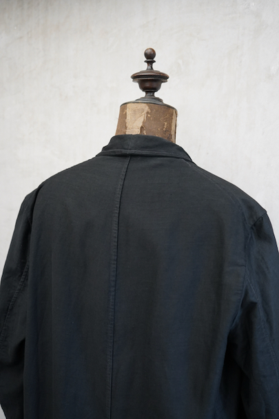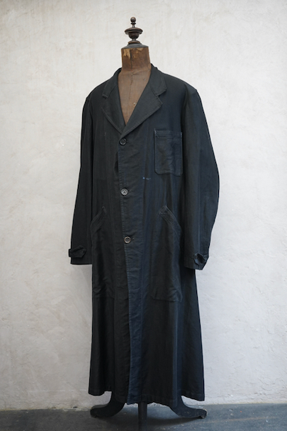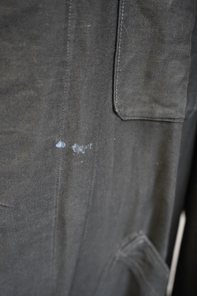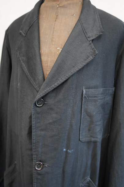 1940年代頃までにつくられた薄いブラック・モールスキンのワークコート。メンズでこの素材のものは少なく、長めの着丈にこの生地感が良いです。フロントに3つのパッチポケット、下方左右のポケットは大きいです。内ポケットが1つ。袖口にタブ。フロント左側に青い塗料汚れがあります。ベルトループがありますが、ベルトはありません。多少の擦れやほつれがありますが、大きなダメージはなく状態は良好です。