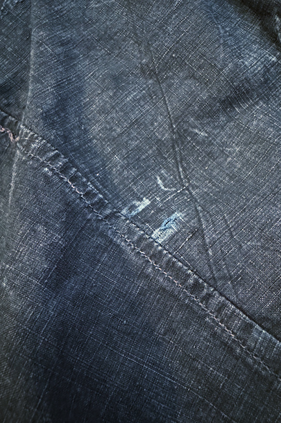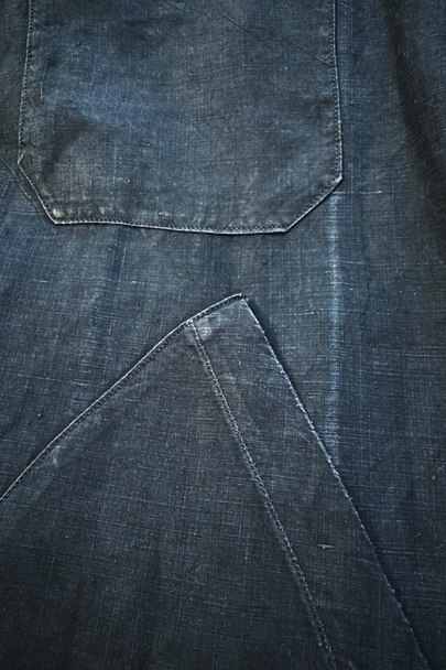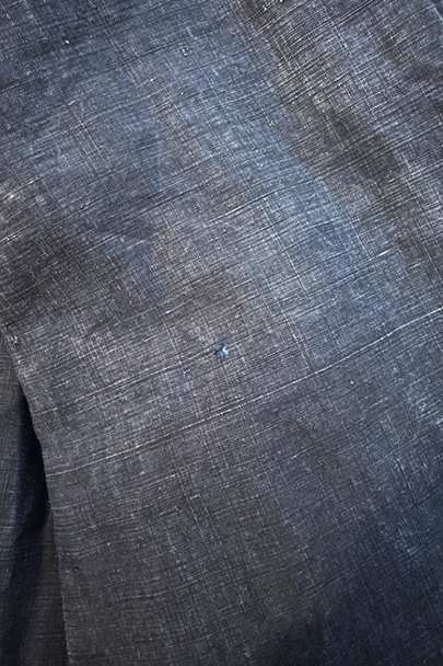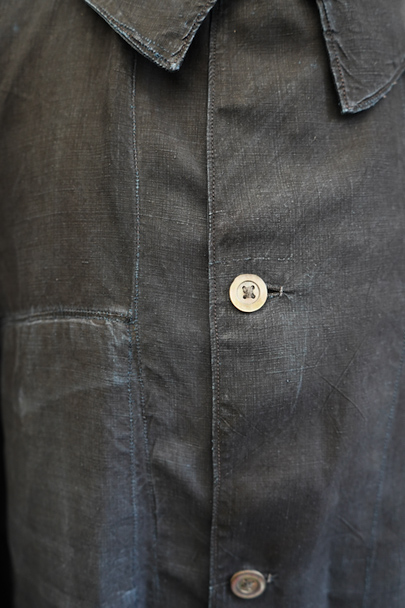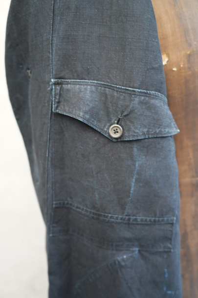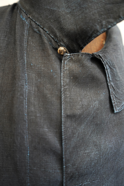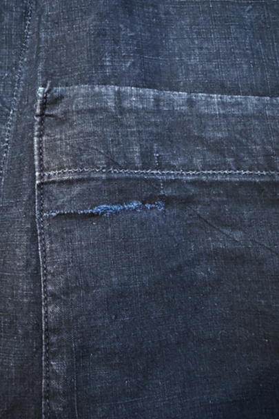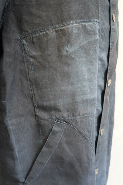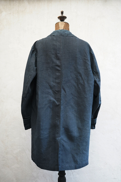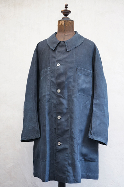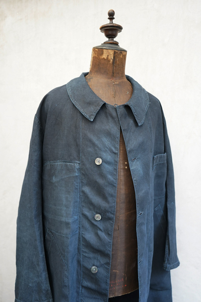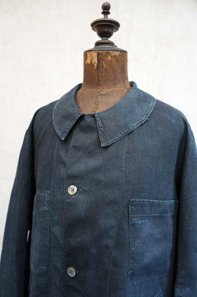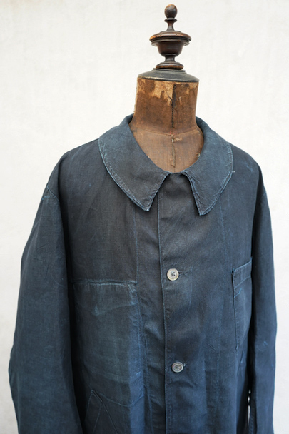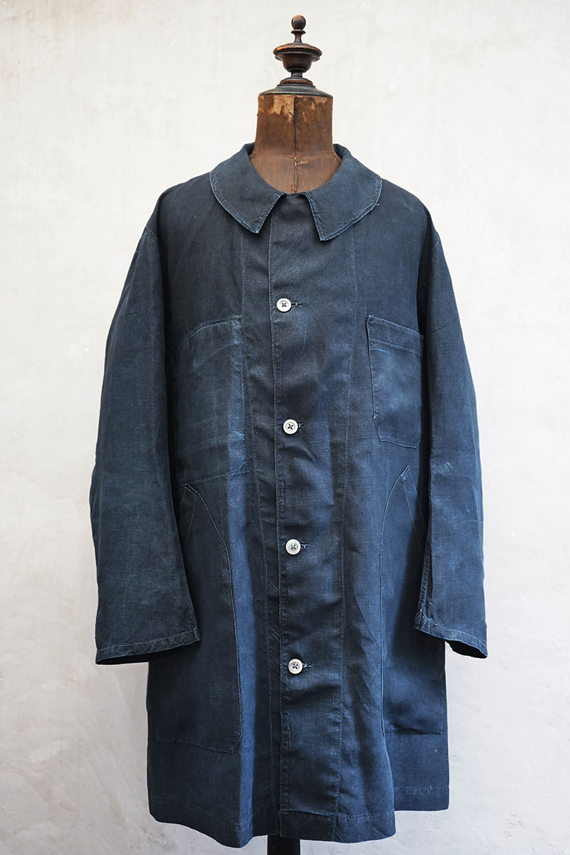 1930年代頃までにつくられたインディゴ染めリネンのワークコート。フレンチワークらしい丸くカーブした平たい襟、フロントは首元に小さいボタンがついていてトップまで留めることができる仕様です。その下と袖口のタブは黒蝶貝ボタン、ボタンホールは手縫いです。右胸内側にボタン留めのフラップ・ポケットがついています。左胸のポケットに傷、その他、小さい穴、傷や擦れがあります。大きなダメージはなく全体的な状態は良好です。