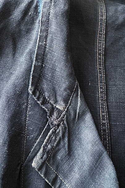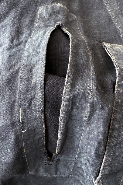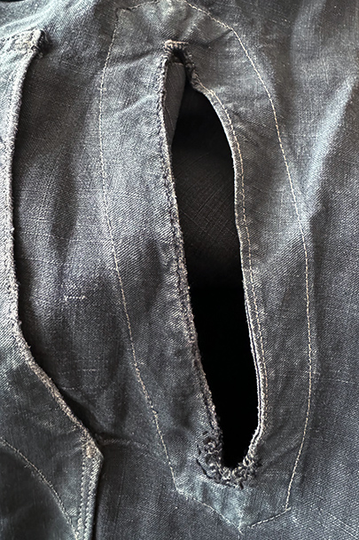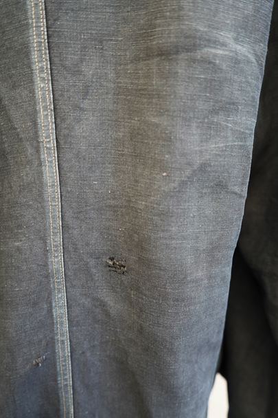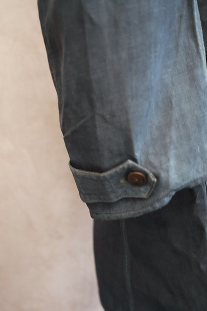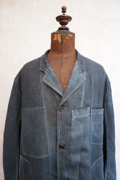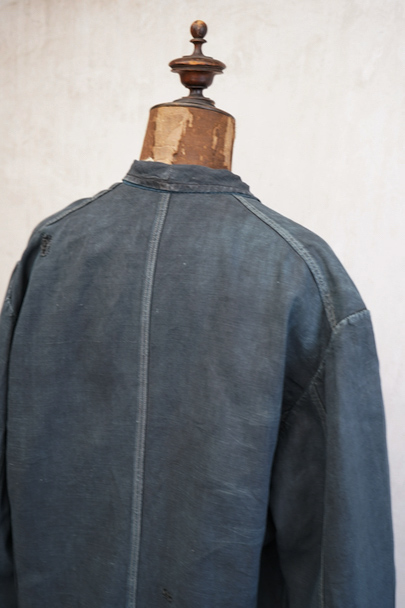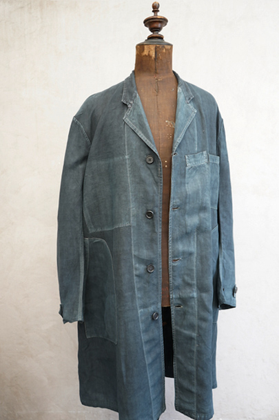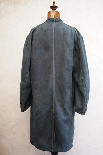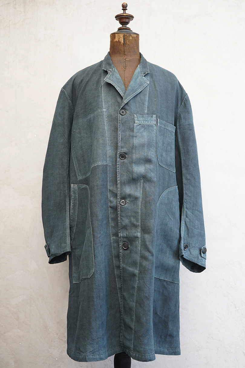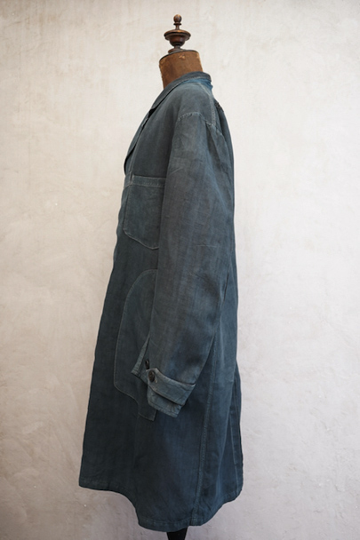 1940年代から1950年代頃につくられたインディゴ・リネンのワーク・コート。マキニョンという家畜の仲買人などが着たものです。"Au Molinel"製。細いリネン糸を高密度で織った弾力のある薄い布地でつくられています。胸に2連のポケット、こちらは長いハサミをいれるポケットがセットインになっています。下方左右に大きなD型のポケット、その外側にコート中にアクセスできるように開きがあります。袖口にはタブ。バックの左肩に3cmほどの直し痕、バック中央に1cm強の直し後、袖口に擦り切れ、両サイドの開き部分に直した痕や擦れた傷みがあります。襟は付け替えられており、バック左右の縫製に縫い直しがあります。その他、擦れや色むら等の経年の傷みがあります。