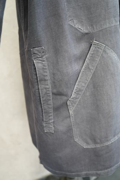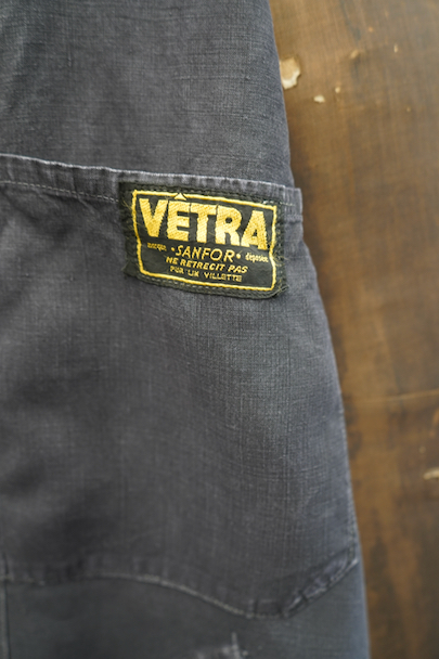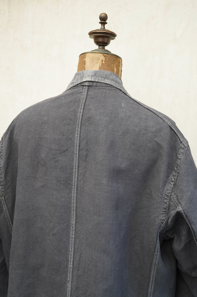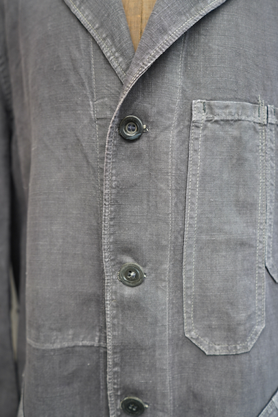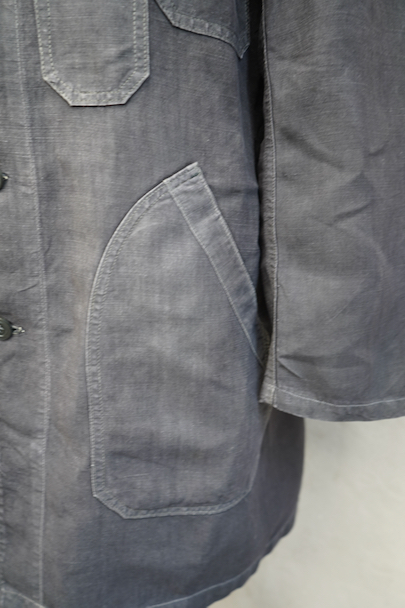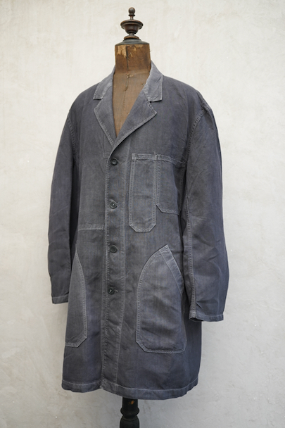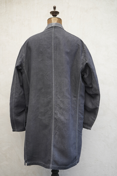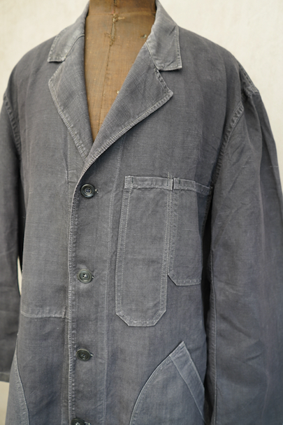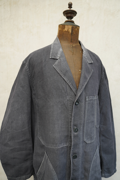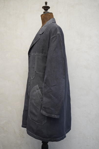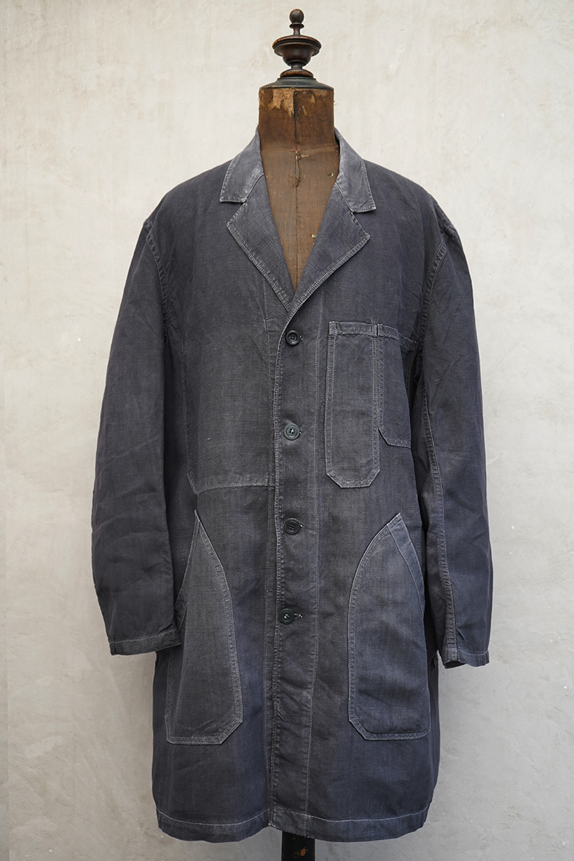 20世紀中期頃につくられたブラック・リネンのワーク・コート。マキニョンという家畜の仲買人などが着たものです。"Vetra製。細いリネン糸を高密度で織った弾力のある薄い布地でつくられています。胸に2連のポケット、長い方はハサミやナイフを入れるためにこの形をしています。下方左右に大きなD型のポケット、その外側にコート中にアクセスできるように開きがあります。浅いサイド・ベンツ。色むら等の使用感はありますが、状態は良いです。表記サイズは48です。