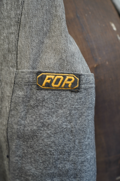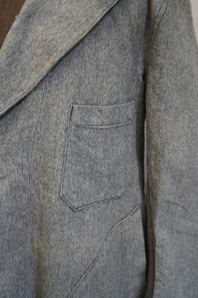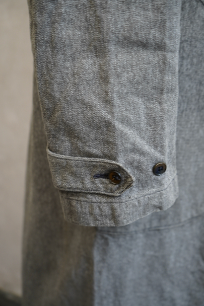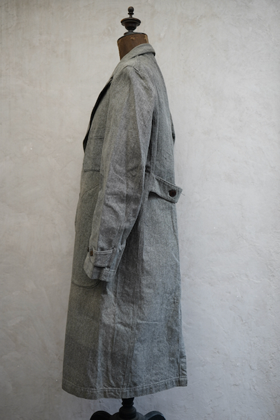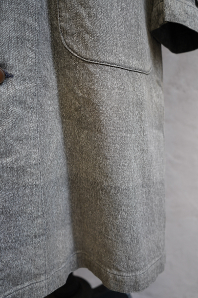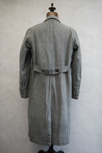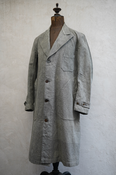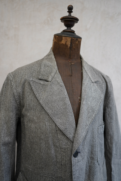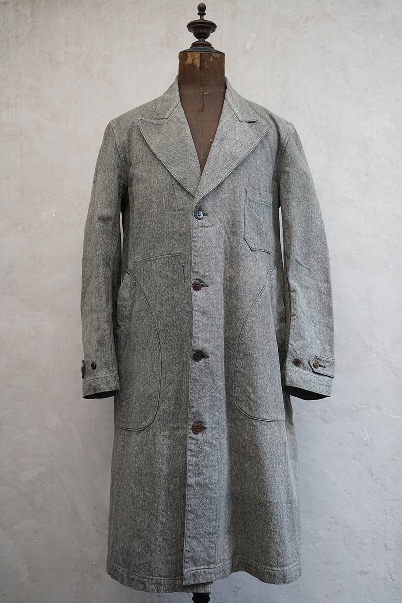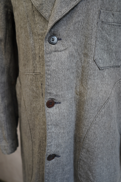 1940年代頃までにつくられたごま塩コットン素材のアトリエ・コート、珍しいピークド・ラペルです。"FOR"、刺繍タグがついています。ややしっかりとした良い布地です。少し傾斜のついた胸のポケット、袖口にタブ、バックにボタン留めのマルタンガルなど、良いディテールです。裾近くの布地に色むらがあります。薄いシミがありますが、大きなダメージはなく状態は良いです。