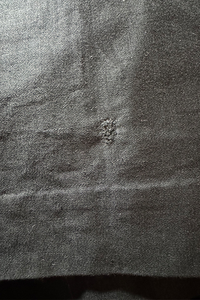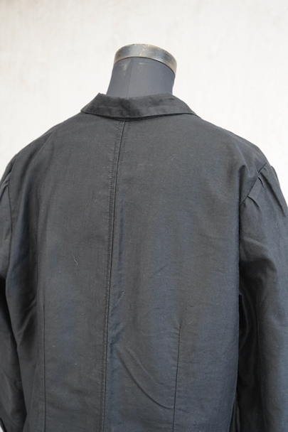 1940年代頃までにつくられたワークコート。程よい光沢のコットン・サテン地は滑らかな質感です。バックにベントが入った珍しいつくりで、手縫いのボタンホールや上部が斜めになって手が入れやすいポケットなど良いディテールです。バック裾近くに1cm程の手縫いの直し跡がありますが、その他の状態は良いです。