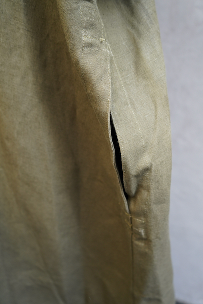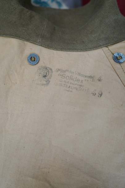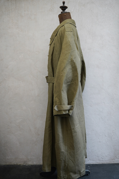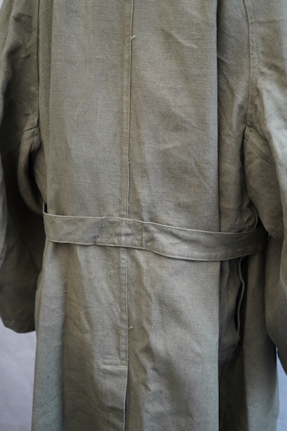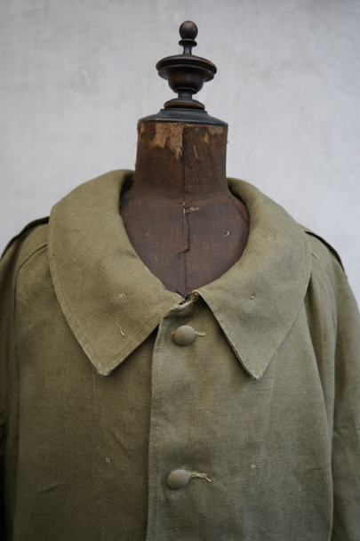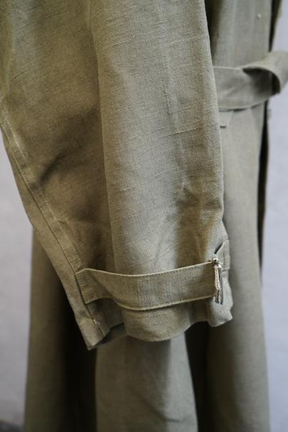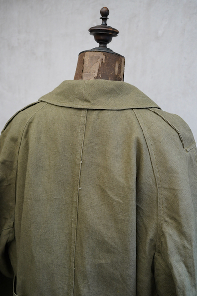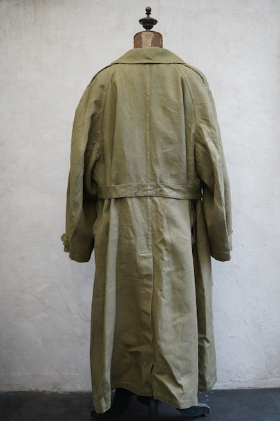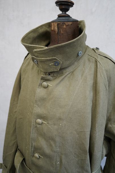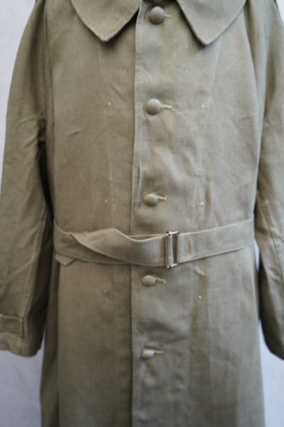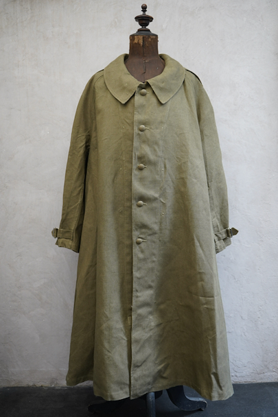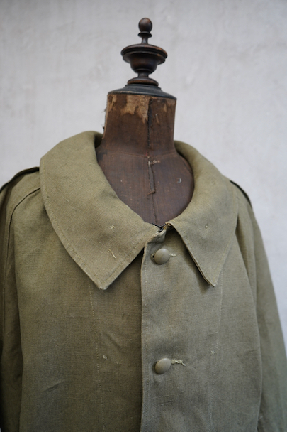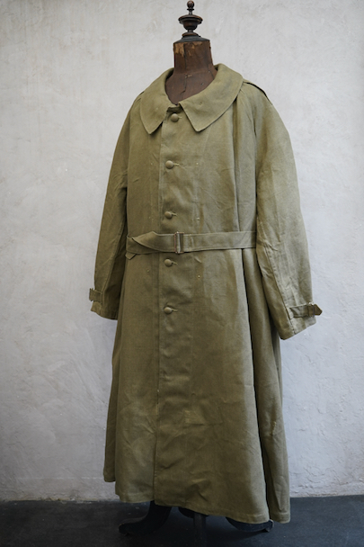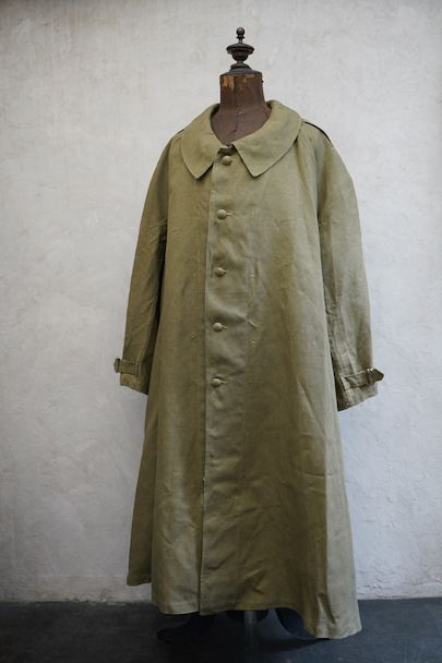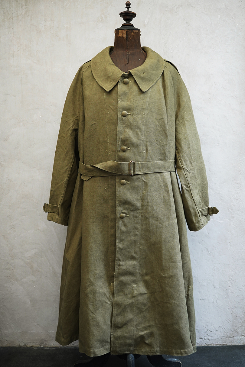 1940年代頃につくられたフランス軍のモーターサイクル ・コート。コットン・リネンやコットンのものがありますが、こちらは一番風合いの良いリネン素材です。表記サイズ2のデッドストックを一度洗濯しています。チンストラップのついた大きな襟、ラグランスリーブ、Aラインのボリュームのあるシルエット、存在感のあるコートです。エポーレット、両サイドに中にアクセスするための開き、袖口にタブ、内側下方には脚に固定するベルトがついています。ウエストのベルトはバックに縫い付けられています。保管中についた汚れ、若干のシミ、色むらがありますが、目立ちにくいです。その他は特に目立ったダメージはなく状態は良いです。