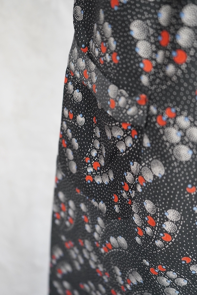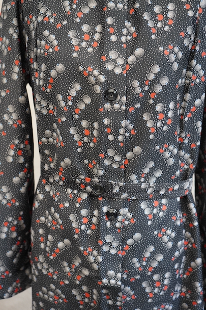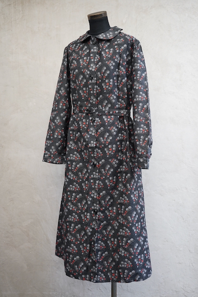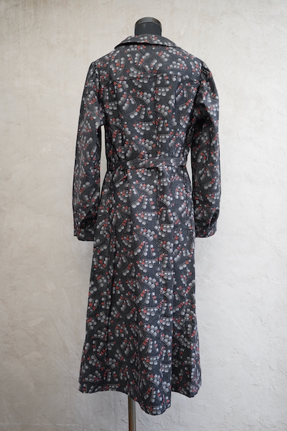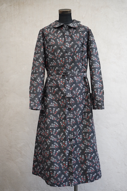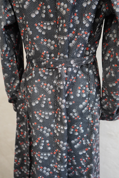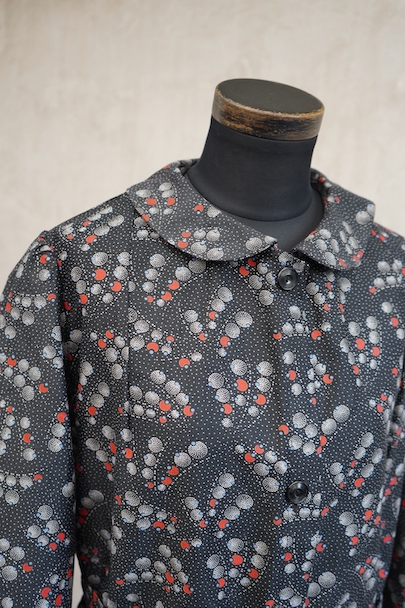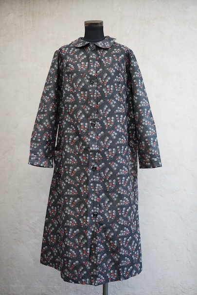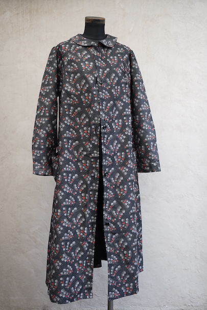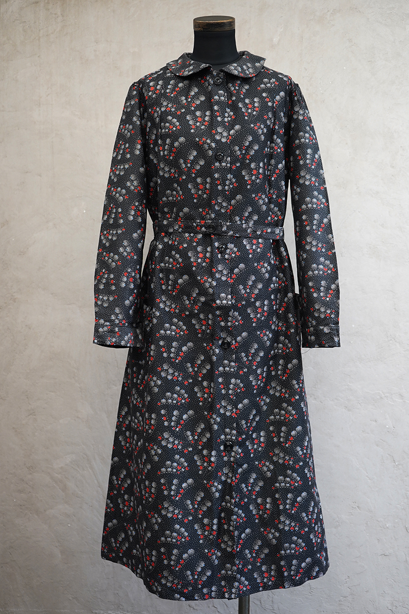 1930年代頃につくられたワークコート。フレンチらしいラウンドカラーで、肩は程よくパフスリーブになっている可愛らしい品です。ベルトが付いています。ドットで柄の珍しい生地で、コットン素材ですがまだ糊が残っているため若干のハリがありますが、使用していくと柔らかくなります。未使用品を一度洗濯しています。状態はとても良いです。このような良い品が未使用で出てくることはとても珍しいので、古いものが好きな方、古いものに慣れていない方にもお勧めです。