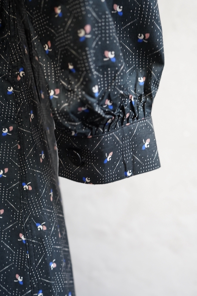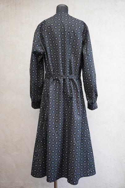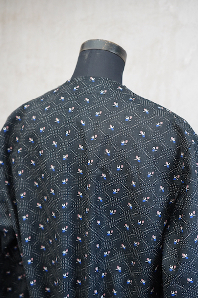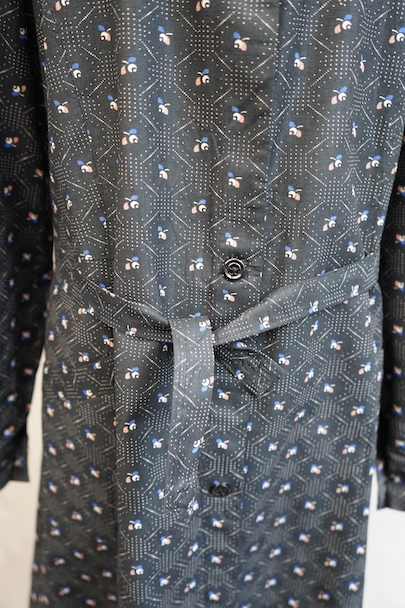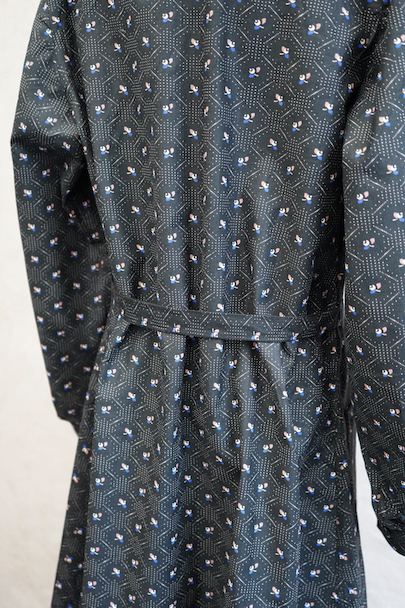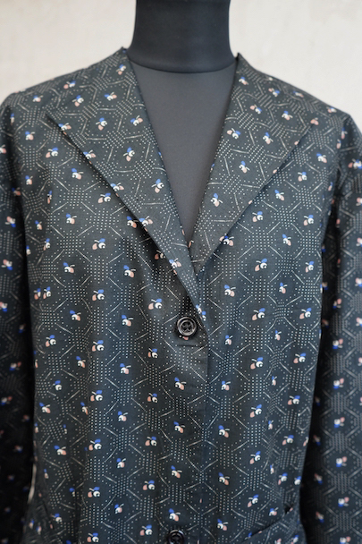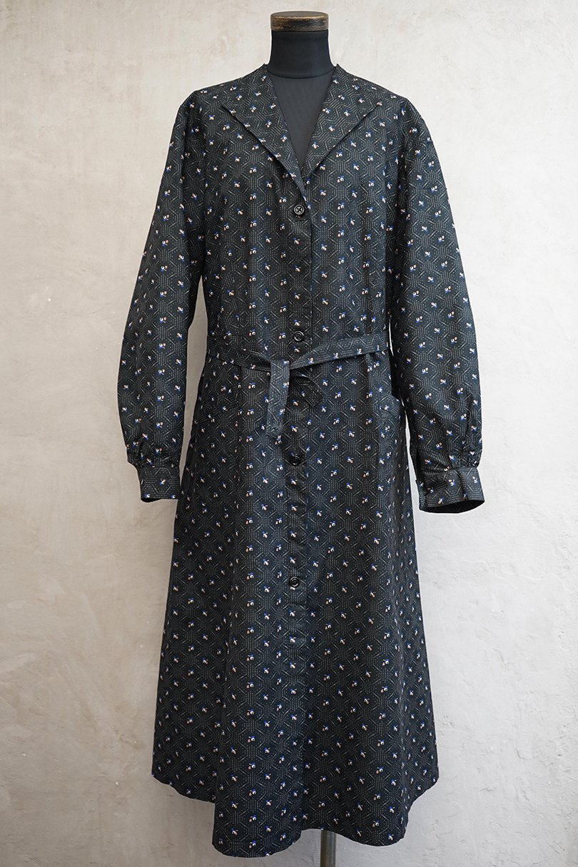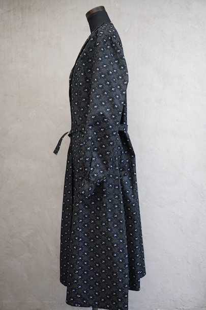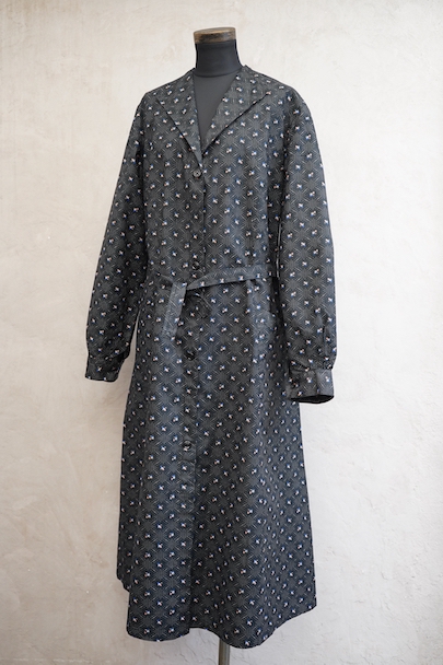 1930年代頃につくられたワークコート。とても珍しい、良いプリント生地が使用されています。コットン素材ですが、まだ糊が残っているためハリがあります。フロントの切り替えの入り方が変わっていて、ウエストが少しシェイプされ、裾に向かって広がる綺麗なシルエットです。ウエストライン右側にベルトが縫い付けられています。未使用品を一度洗濯しています。状態はとても良いです。このような良い品が未使用で出てくることはとても珍しいので、古いものが好きな方、古いものに慣れていない方にもお勧めです。