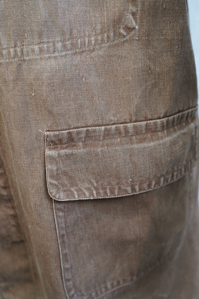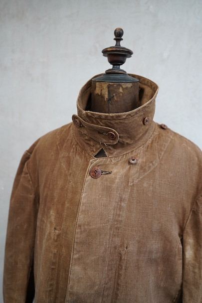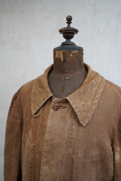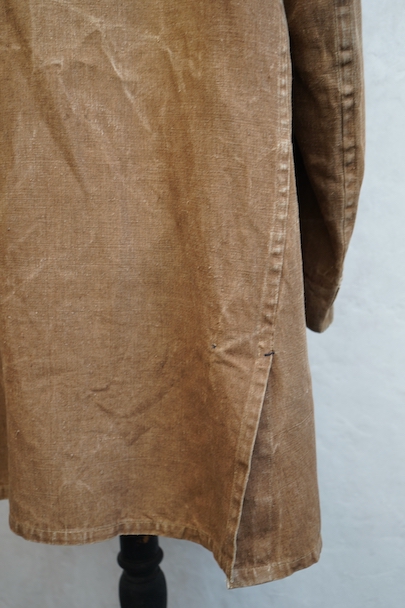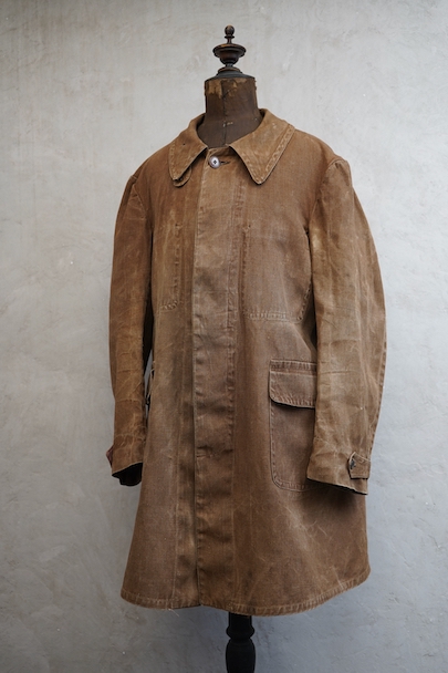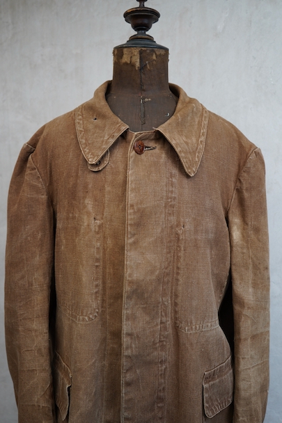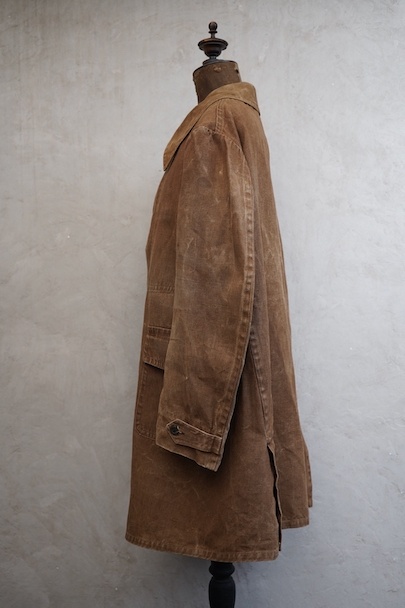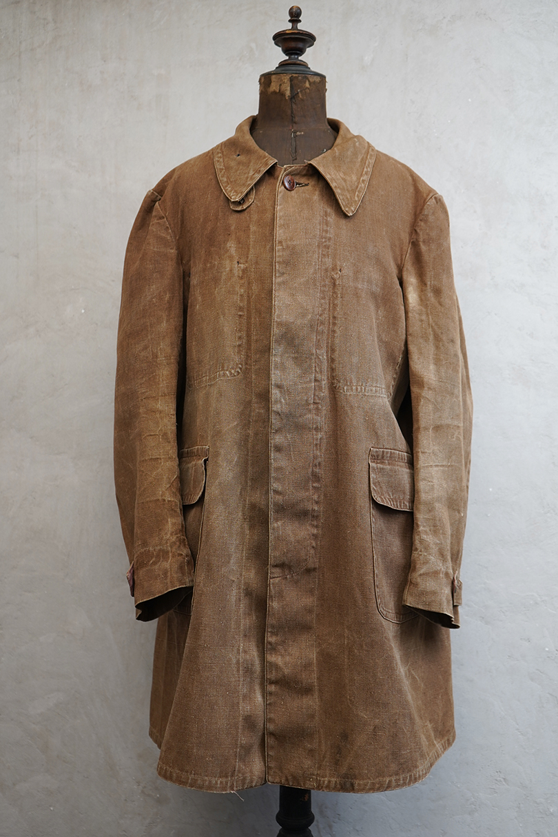 ブラウンカラーのリネン・キャンバスのコート。ハンティングなどで着られたもので、1930年代から1940年代頃のものだと思います。大きめの襟には裏にチンストラップがついています。フロントは比翼仕立て、袖口にはタブ、フロント下方左右にフラップ・ポケットがつきます。両胸の内側にもポケットがあります。膝丈くらいで、サイド・ベンツ。 元々はケープがついていたらしく、襟の裏にそれを留めるためのボタンが残っています。全体的にアタリや多少の擦れ、小傷などがありますが、大きなダメージはなく、状態は良いです。
