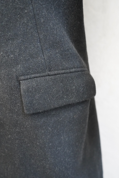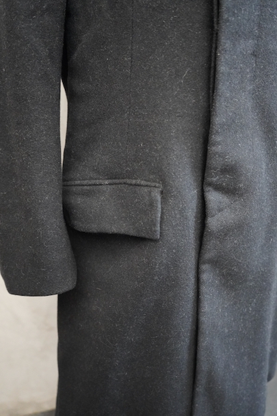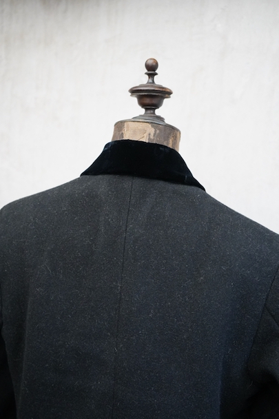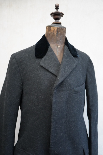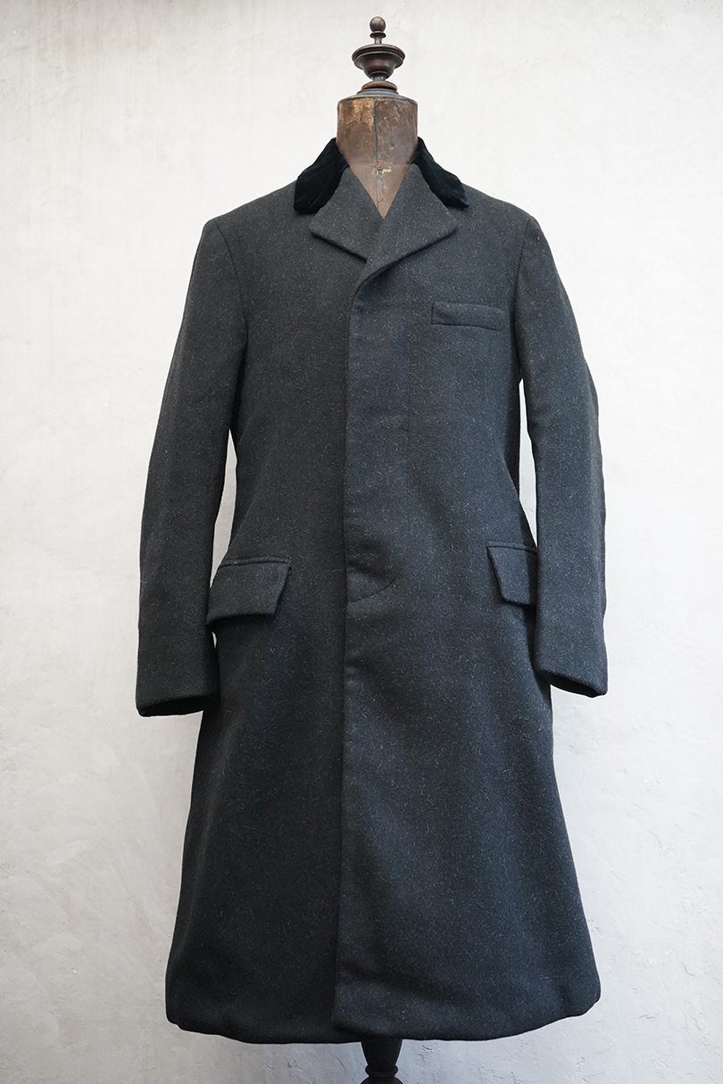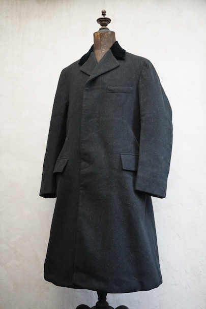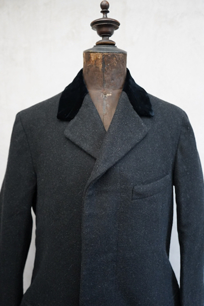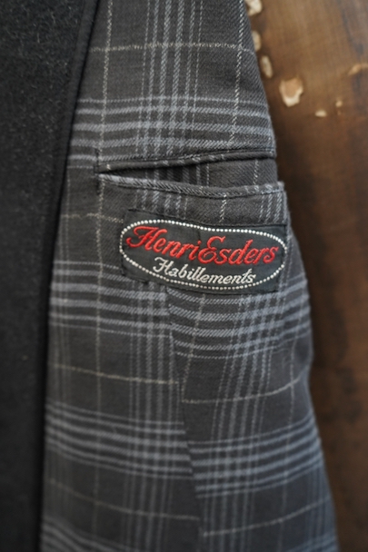 Henri Esdersのチェスターフィールド・コート。1930年代頃までにつくられたものだと思います。ウエストで絞られ裾に向かって広がるシルエット。しっかりとしたウール素材、ベルベット張りの上衿、フライフロント、上品な印象です。コロゾナットのボタン。裏地はチェック柄コットン素材、内ポケットが2つ。使用感は少なく状態は良いです。