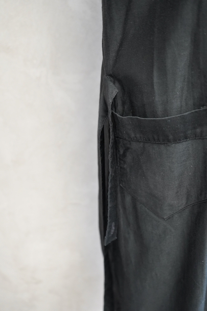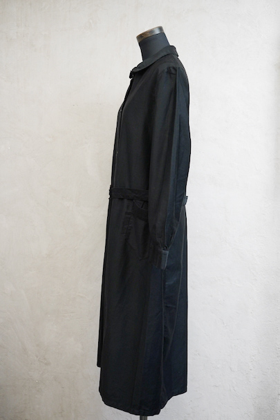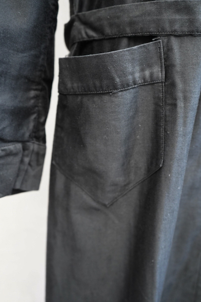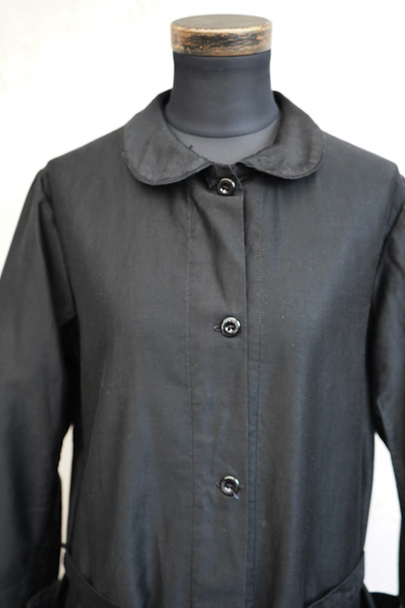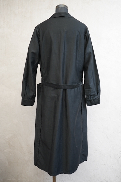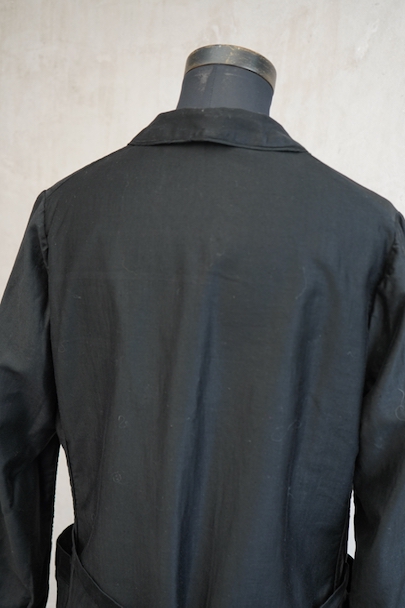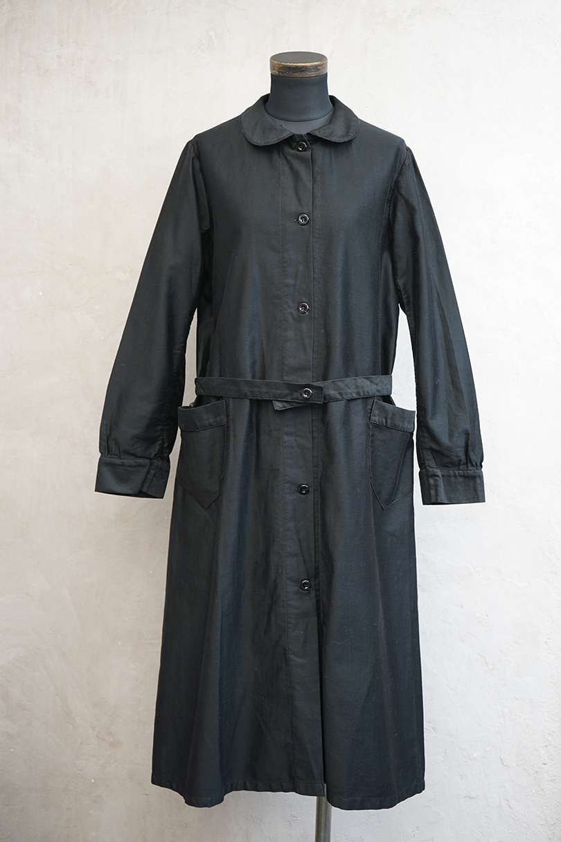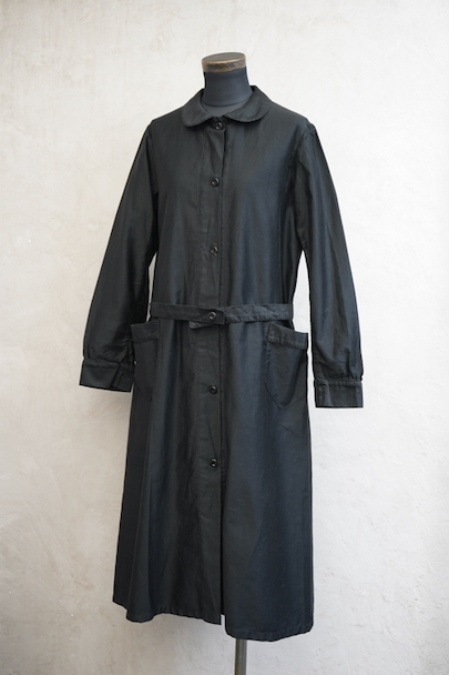 1940年代頃までにつくられたワークコート。程よい光沢のコットン・サテン地は滑らかな質感です。ほとんど着用されていないようで、まだ糊が残り若干ハリがあります。小ぶりの丸襟、ガラスボタン、右側に縫い付けられたベルトなど良いディテールです。左右ポケットの間くらいに小さな穴があります。使っていくと更に柔らかさがでて、良い風合いになると思います。前開きなので羽織ものとして、またはワンピースのような感覚でご使用いただけます。