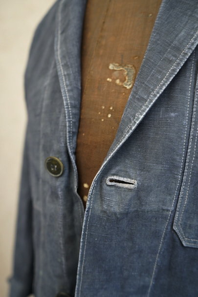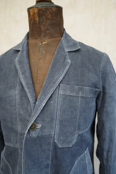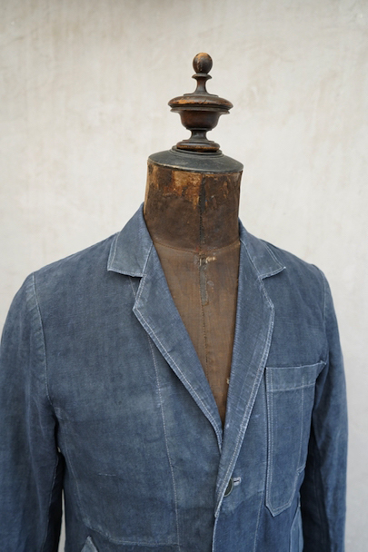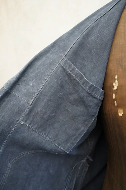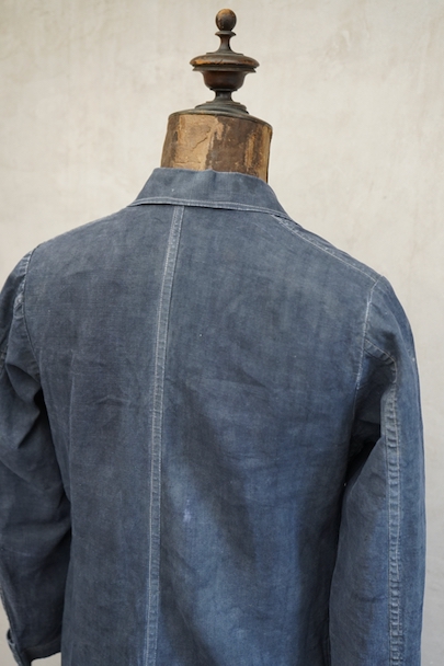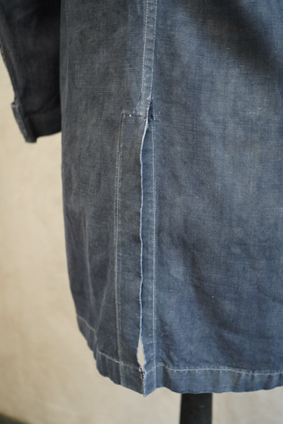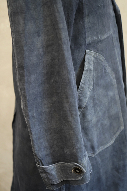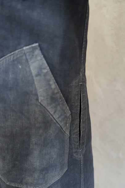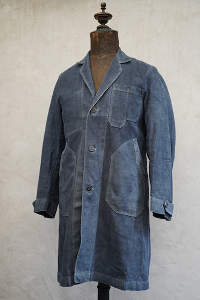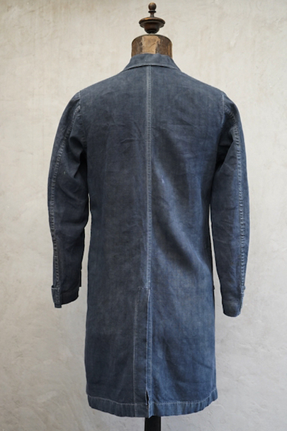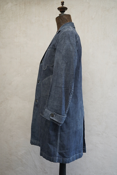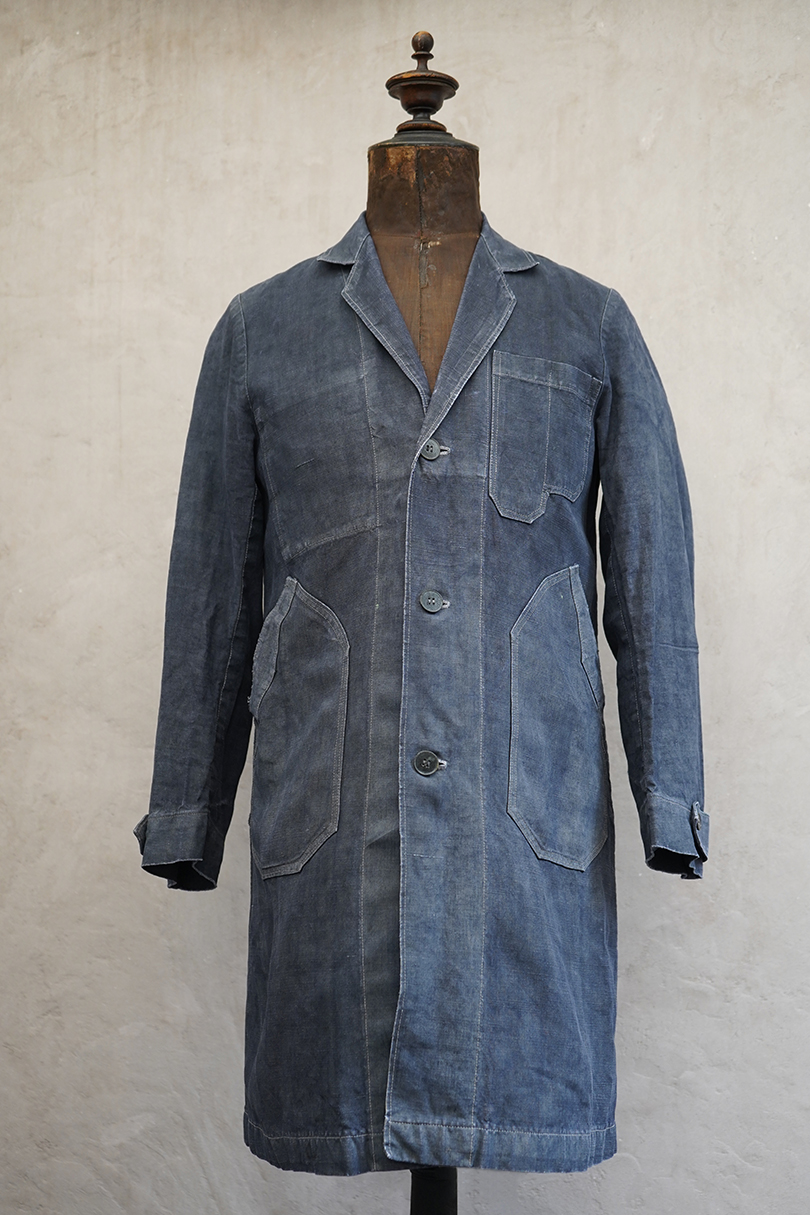 1940年から1950年代頃につくられたボーイズ・サイズのマキニョン・コート。使い込まれてブルー・グレーに色落ちした黒リネン素材。胸にハサミ用を含む2連のポケット、下方左右に大きなパッチポケット、その外側にはコート中にアクセスする貫通ポケットもあります。内ポケットが1つ。袖口にタブ。色褪せ、擦れ、ほつれ等がありますが、元々比較的しっかりとした生地なのでまだまだご愛用いただけると思います。小さいサイズで、小柄な女性にお薦めです。