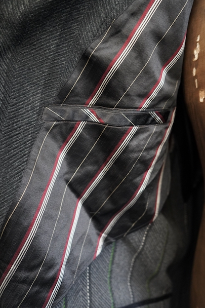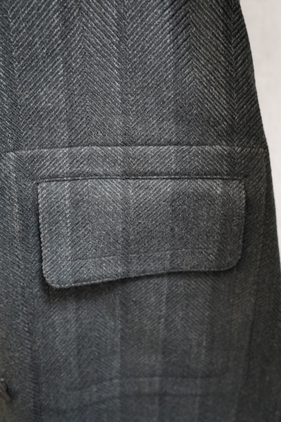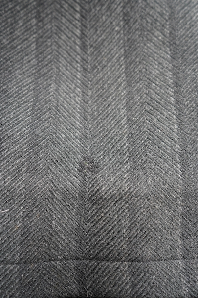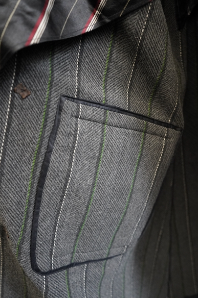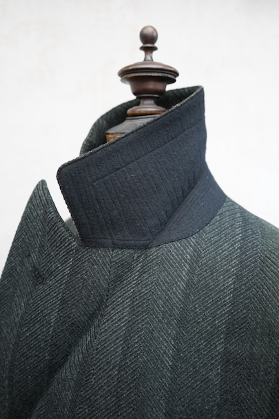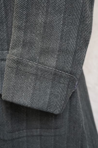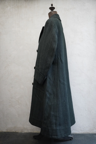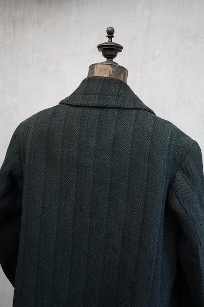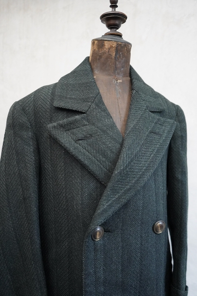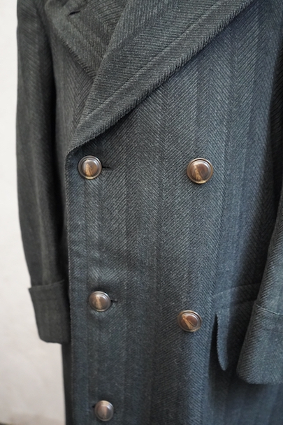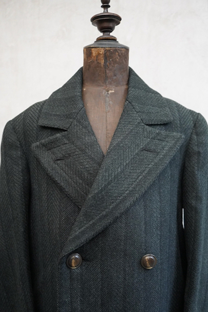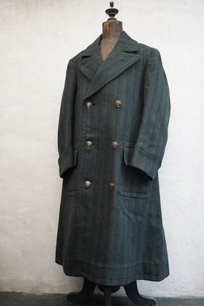 1930年代頃までにつくられたダブルブレスト・コート。ヘリンボーン織りで少しグリーンがかった色のストライプ柄の厚いウール素材、良い風合いの布地です。ワイドラペルの大きな襟、ポケットは下方左右と内ポケットが2つ、袖口は折り返しです。ボタンはコロゾナット。バック裾近くに1.5cmの直し痕、左肩などに擦れた傷みがありますが、全体的には使用感は少なく状態は良好です。
