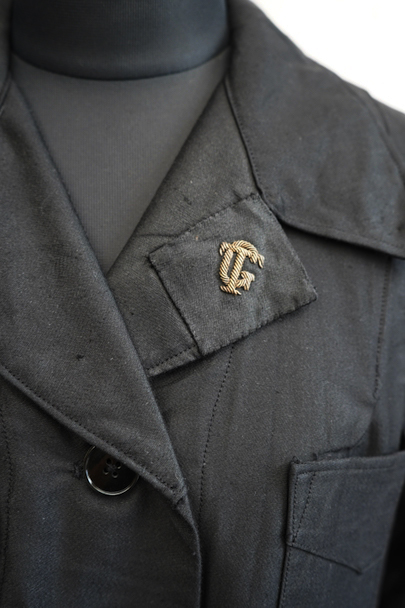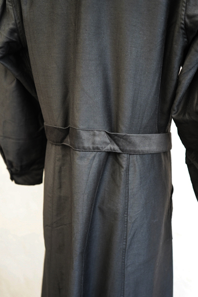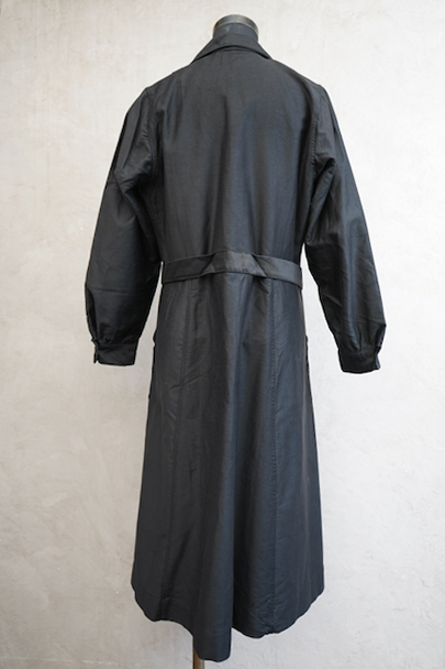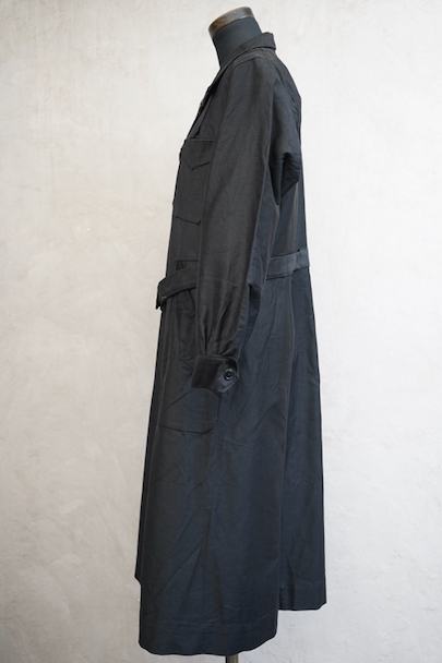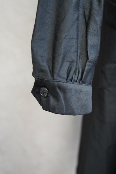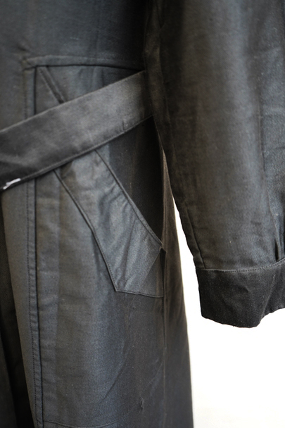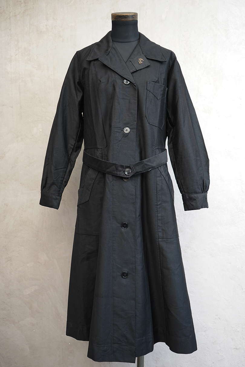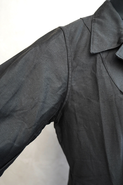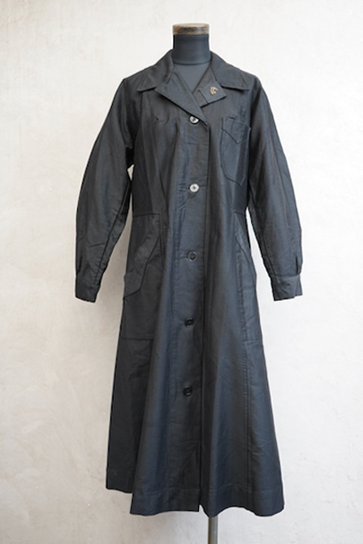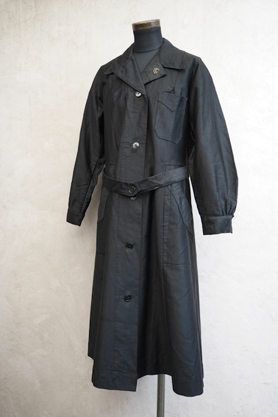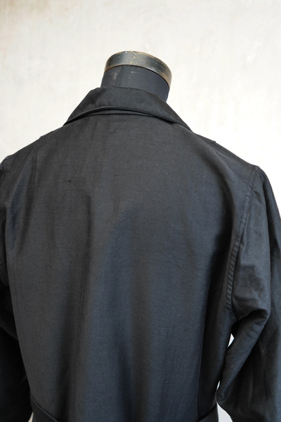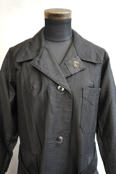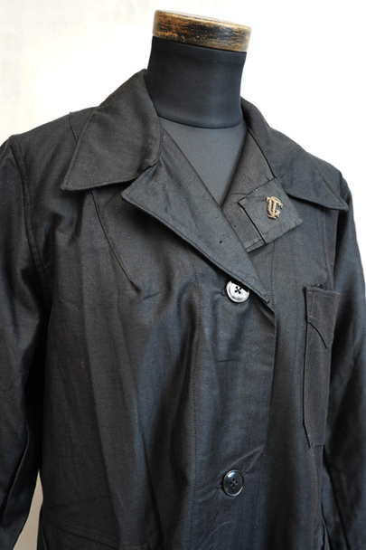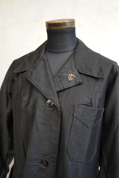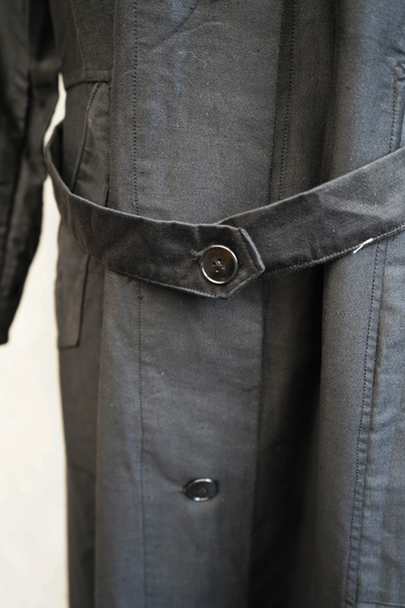 1940年代頃までにつくられたライト・モールスキンのワークコート。未使用品を一度洗濯しています。程よい光沢と滑らかな質感のコットン素材です。襟にはメタル刺繍、Vステッチの細長い胸ポケット、サイドの切り替えなど、個性的で良い作りの品です。ボタンホールは手縫い。ウエストのベルトはバックで縫い留められています。