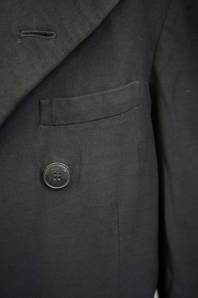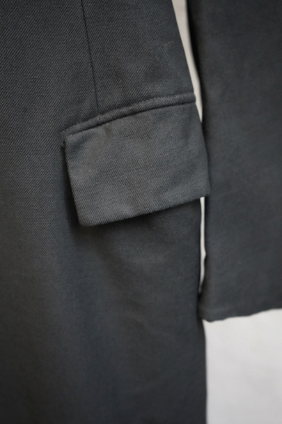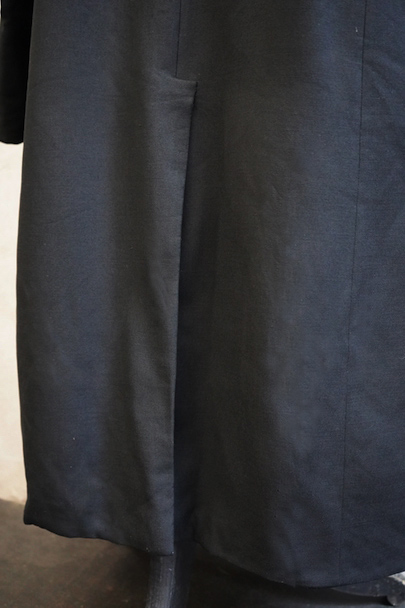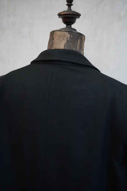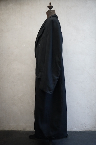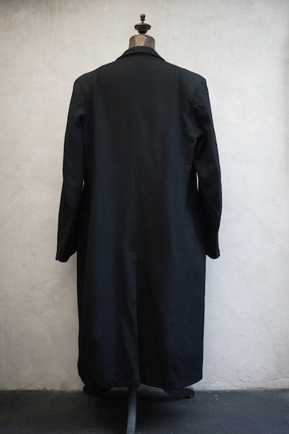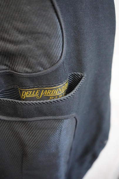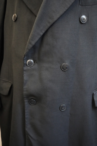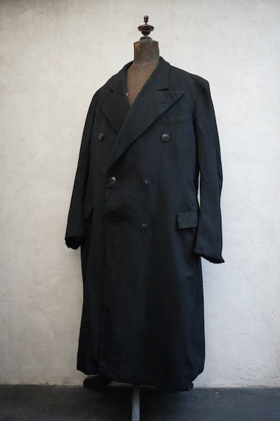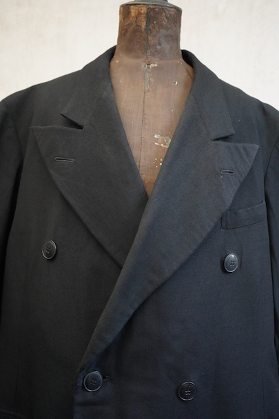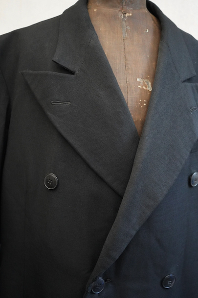 "Belle Jardiniere"のダブルブレスト・コート。1930年代から1940年代頃につくられたものだと思います。ブラック・ウール素材です。大きなラペルが目を引きます。バックに深いセンターベント。ボタンはコロゾナット。前立ての左のラペルの付け根あたりに小さい直し痕があります。全体的に状態は良いです。