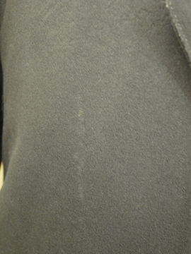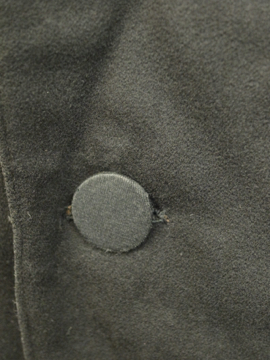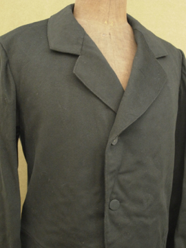 20世紀初期頃につくられたジャケット/コート。中厚手のウール素材です。バックやウエストの切り替えや袖が立体的で美しいつくりです。襟裏には細かいステッチが入っています。内側の左胸にポケットがあります。表面全体的にスレや穴、汚れなどの傷みが見られます。その他、バックとフロントについた包みボタンにスレや汚れ、裏地には大きく裂けた部分がある等、経年の傷みがあります。とても良い形ですので、ダメージを気にされない古いものが好きな方にお勧め致します。
