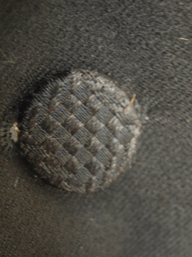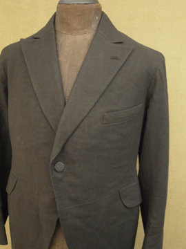 1930年頃までにつくられたジャケット/コート。中厚手のウール素材です。ボタンが1つのフロント、バックやウエストの切り替えや袖が立体的で美しいつくりです。大きめのラペルの襟が綺麗で、襟裏には細かいステッチが入っています。ポケットは胸のみで左右についたフラップは飾りです。内側は両胸にポケットがあります。右襟に小さな穴、表面全体的に多少のスレや薄い汚れ、裏地に穴が1つとほつれがあります。比較的状態は良好ですが、ダメージを気にされない方にお勧め致します。
