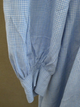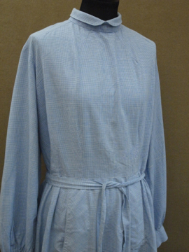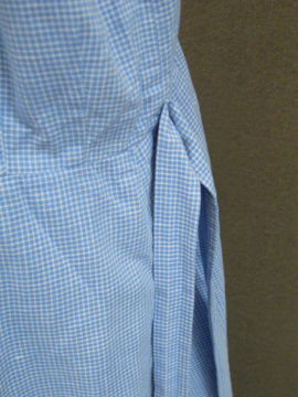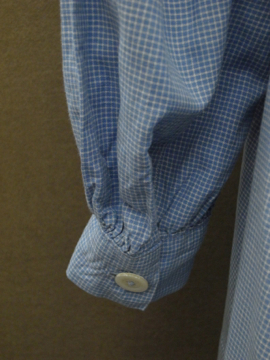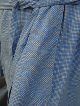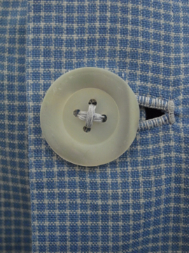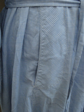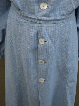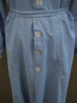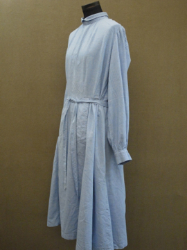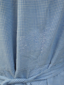 淡いインディゴ染めの糸と白糸のチェック織りのワークドレス。おそらく1940年代頃までにつくられたものです。バックをボタンで留める仕様、ナチュラルな風合いが良い大きめのシェルボタンがついています。ボタンホールは手縫い、所々直しが入っています。ウエスト部分に切り替えが入り、その下のフロント左右にポケットがついています。ベルトはウエスト右に縫い付けられています。フロントの切り替え上あたりに5cm角と2cm角の大きめの直し痕があります。