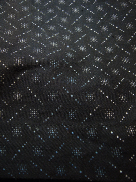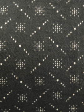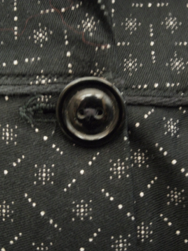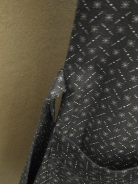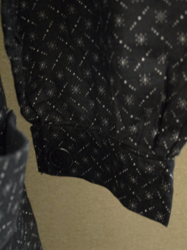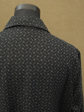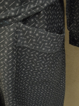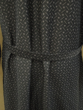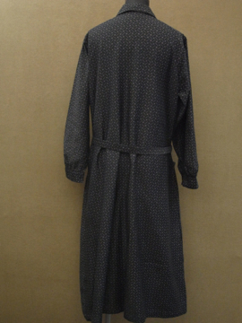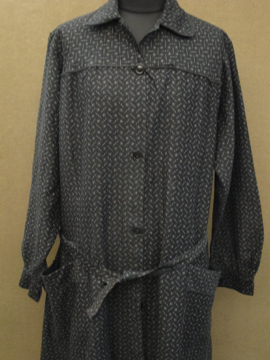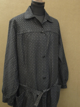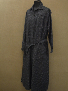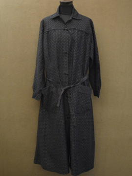 1940年代頃につくられたプリント・ワークコート/ドレス。比較的薄手のコットン素材です。ネックやフロント上部、ポケットに黒のパイピングが施されています。ボタンはプラスチック製、フロント一番上が付け替わっています。ベルトはウエスト右に縫い付けられています。0.8cmから1cmの穴が3カ所あります。バック裾やベルトに青く染まった部分があります。目立ちにくいですが、ダメージを気にされない方にお勧めいたします。