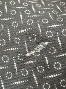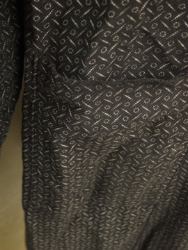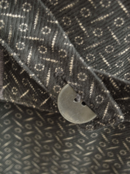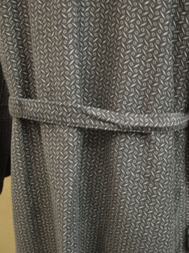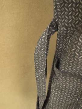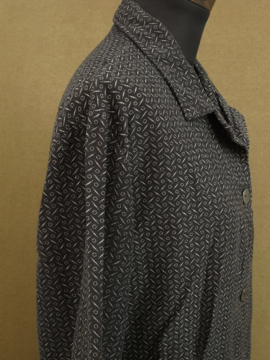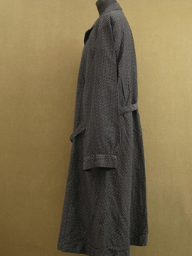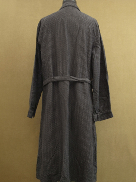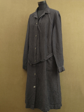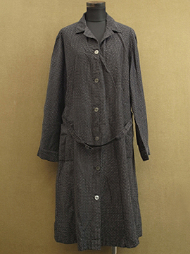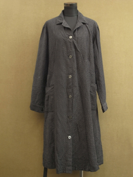 1940年代頃につくられた女性用のプリント・ワークコート。綾織りの柔らかなコットン素材に、細かくドットで描かれた柄がきれいです。ボタンはプラスチック製。ウエストライン右側にベルトが縫い付けられています(ベルトを使用しないときはポケットに入れておくと邪魔になりません)。ベルトのボタンに割れ、脇周りに直し痕、その他糸のほつれや小さな直し痕、擦れなどの使用感があります。クタッとした風合いが良い品なので、ダメージを気にされない方にお勧めです。