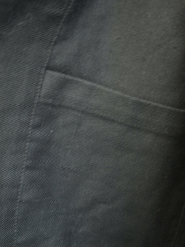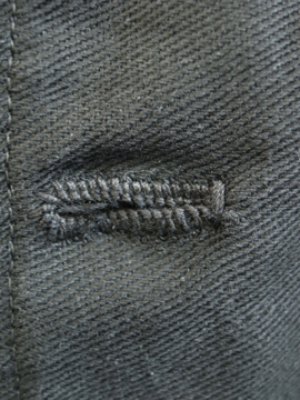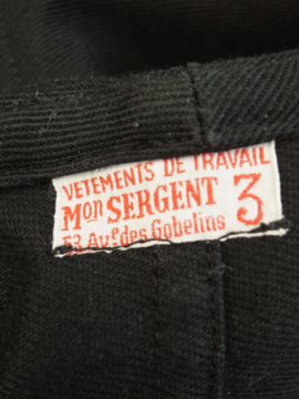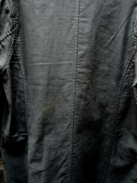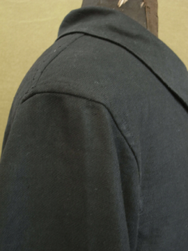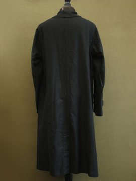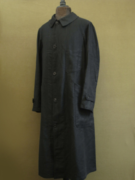 1930年代頃につくられたワークコート。しっかりした黒いコットンツイル素材、ありそうでない希少な品です。丸い襟でAラインのロング丈、斜めについた胸ポケットや袖口にタブがつく等、ディテールも良いです。擦れや汚れがある等、多少の使用感はありますが大きなダメージはなく状態は良いです。