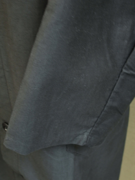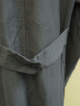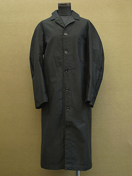 1930年から1940年代頃につくられたワークコート。デッドストック品を一度洗濯しています。素材はコットン、薄手のモールスキンのような目の詰まった若干光沢のある良い素材です。立体的な袖のつくり、バックに縫い付けられたベルト、ボタンはガラス製。シンプルですがディテールが良いです。状態はとても良いです。